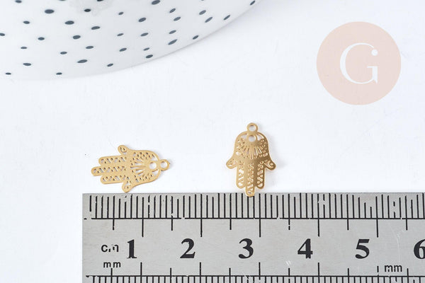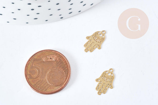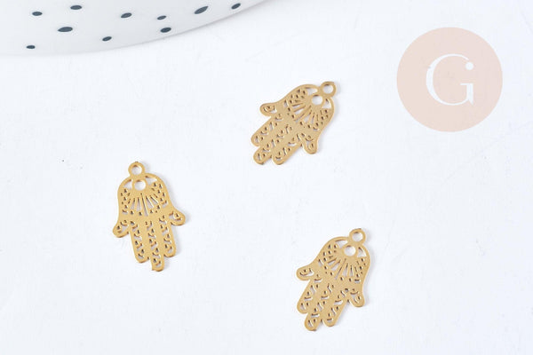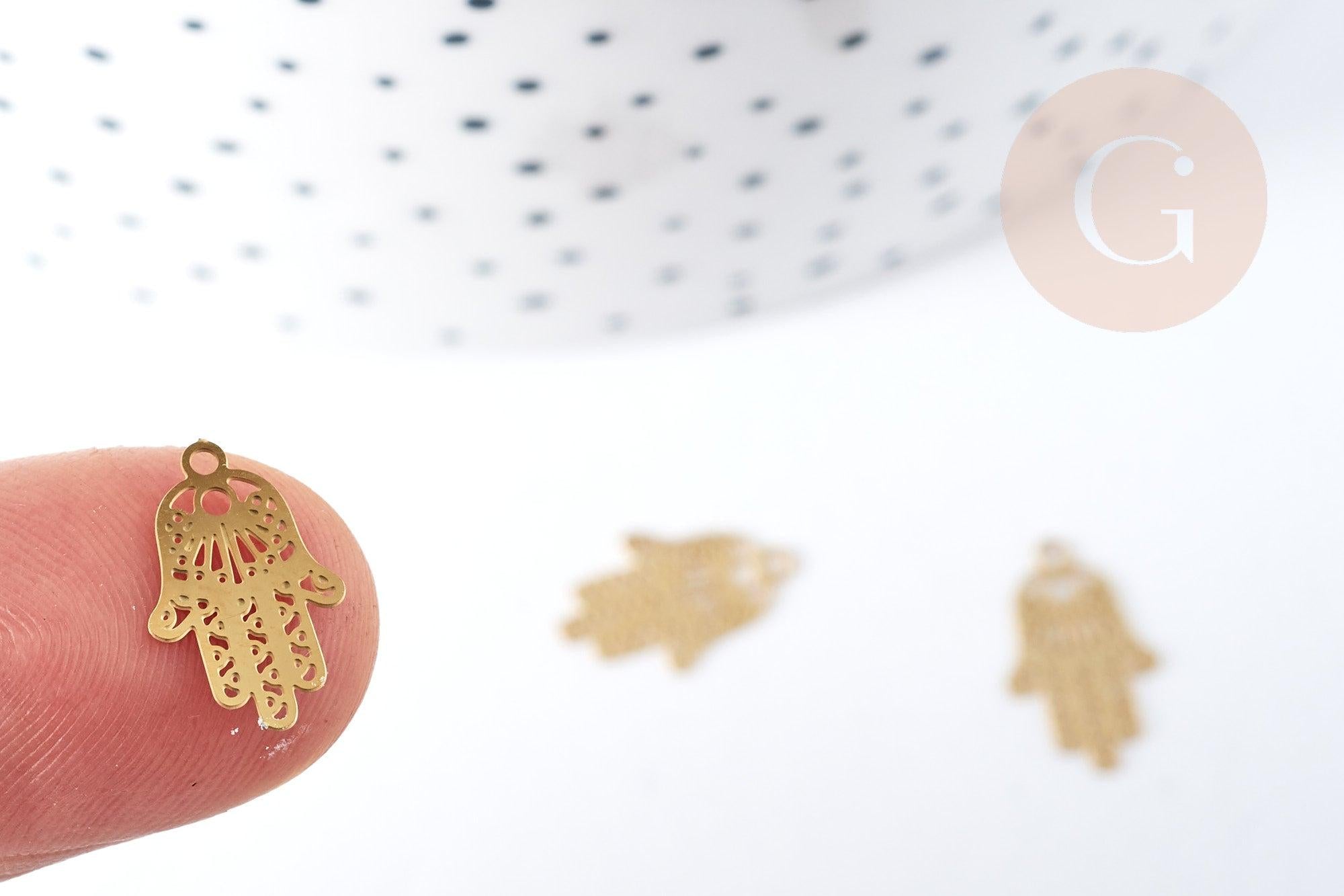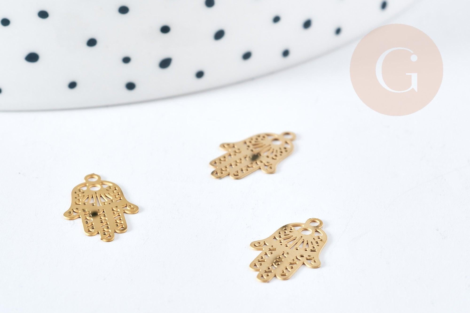 El charm mano de Fátima en acero dorado es un colgante de la suerte para crear joyas de acero inoxidable.