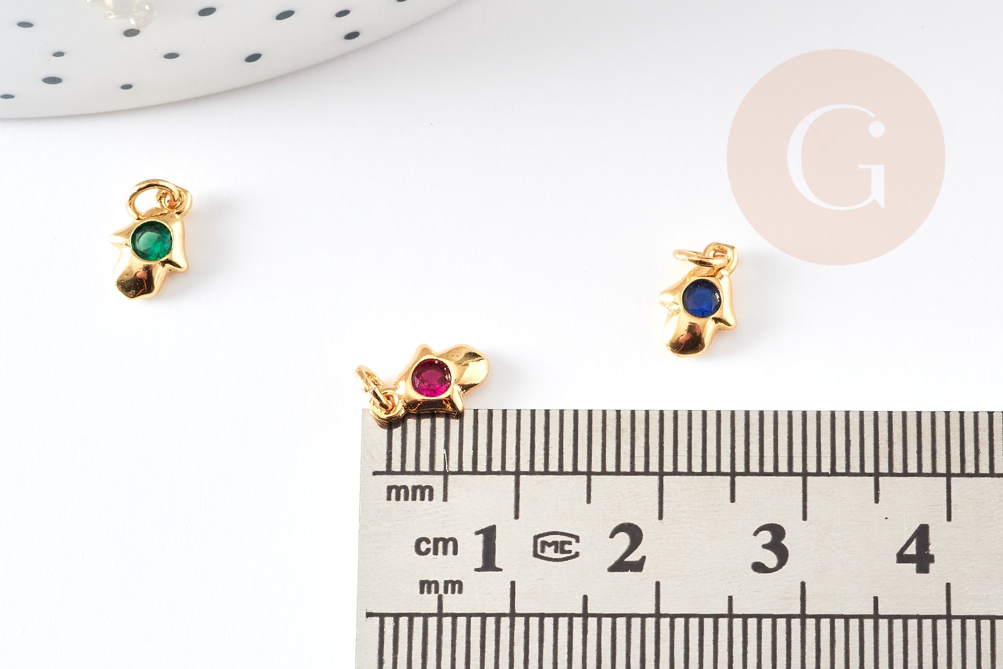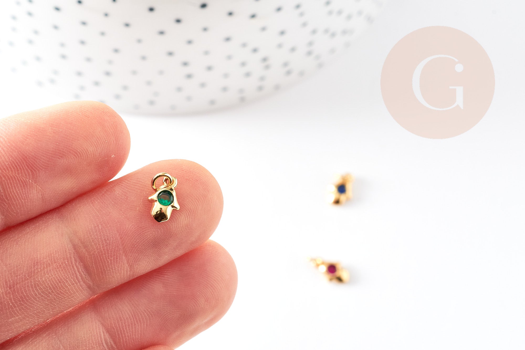 Para realizar magníficos collares, pendientes y pulseras, adopte esta mano de fatma, un pequeño colgante religioso y amuleto de la suerte de latón dorado, decorado con una pequeña circonita brillante de colores.