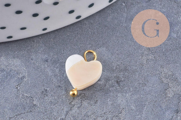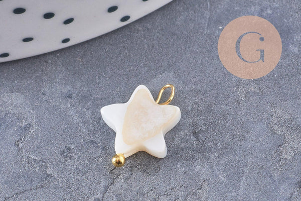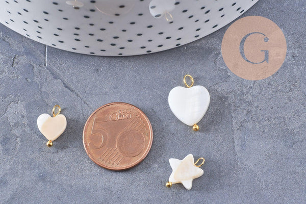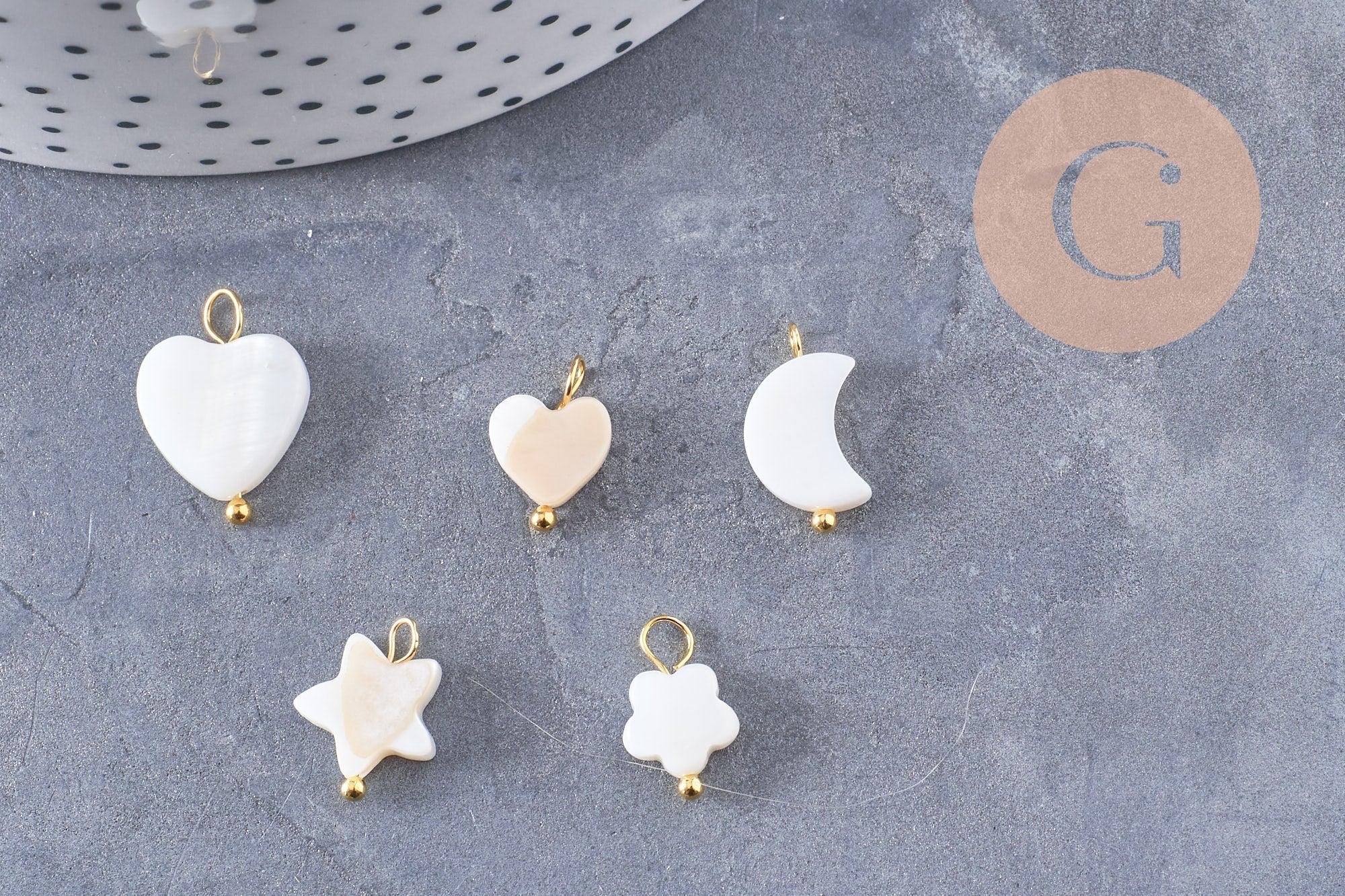 Charm de nácar blanco natural con forma de corazón, estrella, luna, flor y zamac dorado de 13~16,5 mm, x1 (G10090)