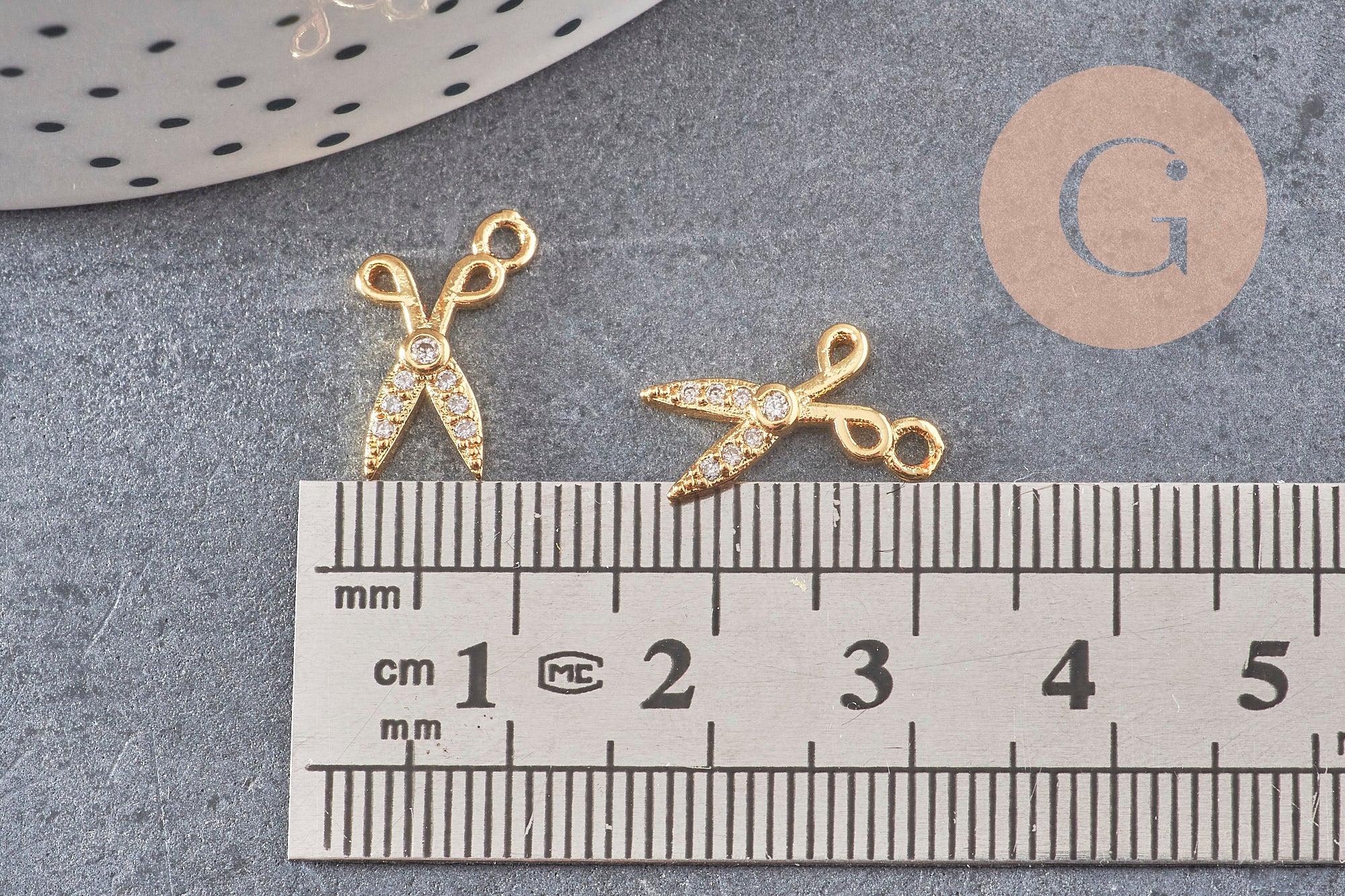 Para crear magníficos collares, pendientes y pulseras, adopta este lindo colgante dorado en forma de tijera, en latón dorado y circonitas blancas.