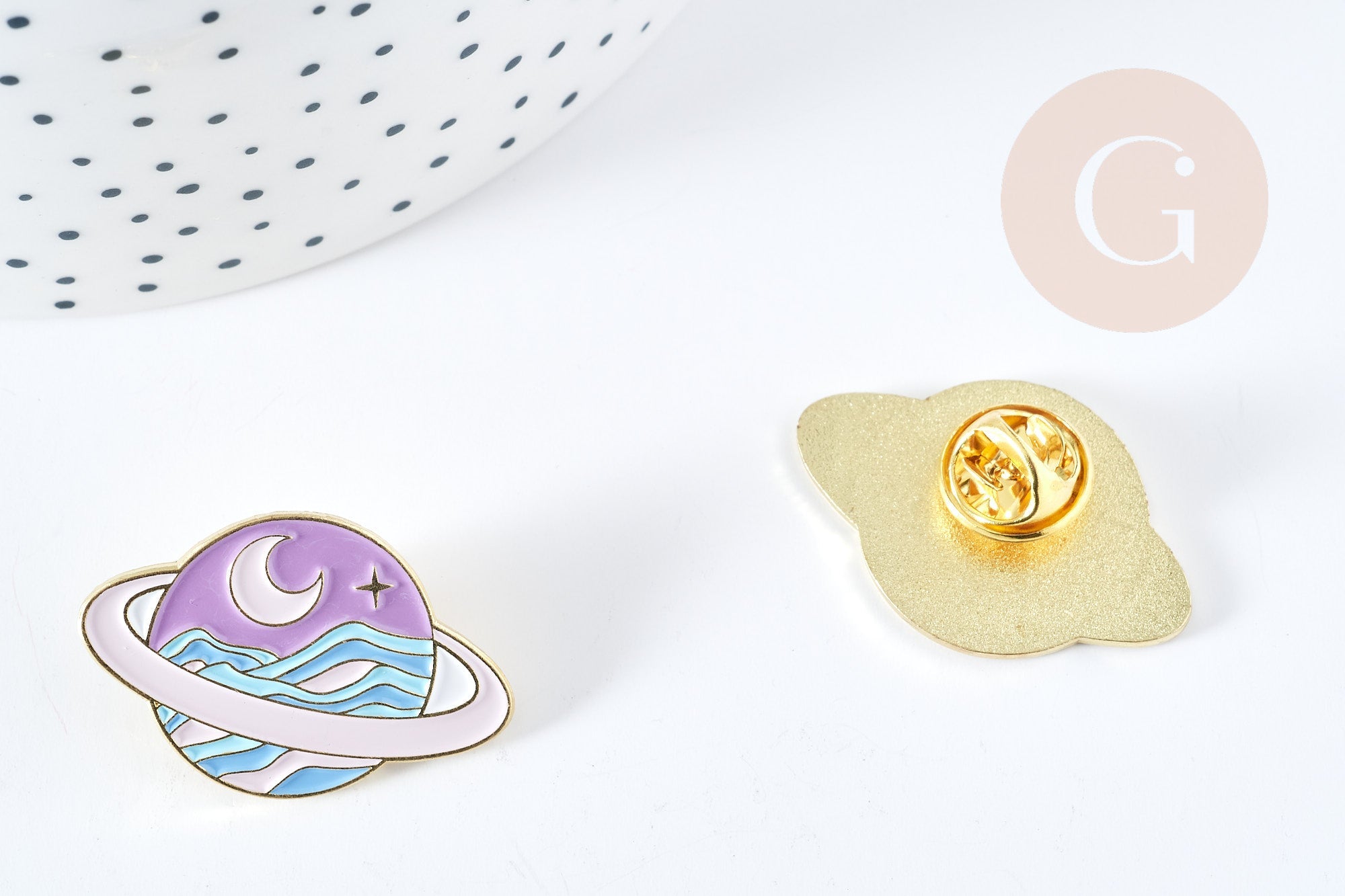 Un pin de planeta con sus anillos esmaltados en colores pastel, todo en zamac dorado y esmalte de colores.