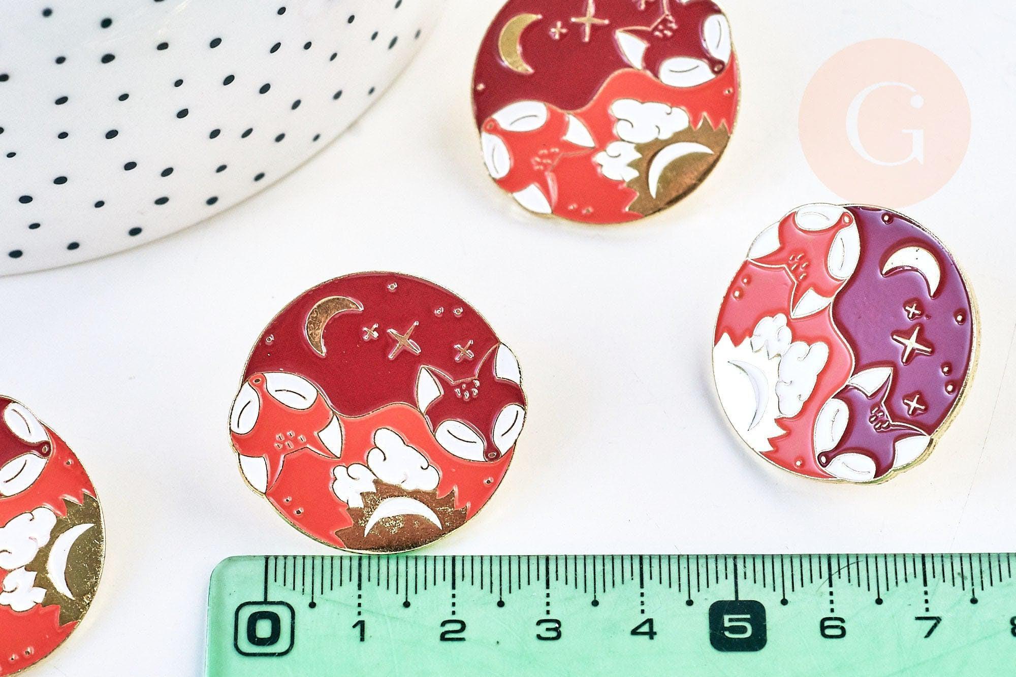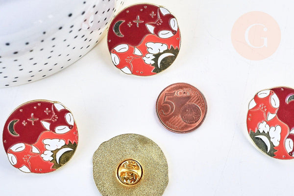 Precioso broche/pin que representa dos zorros rojos anidados, en zamac dorado y esmalte de color. Con su bonita decoración de luna y estrellas, será perfecto como pequeño regalo.