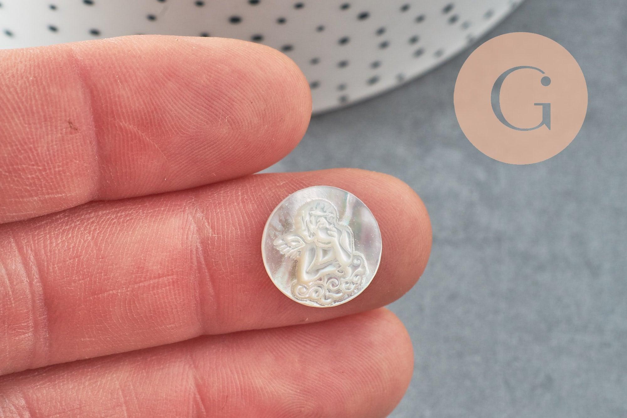 Añade un toque delicado a tus creaciones de bisutería DIY con este cabujón redondo de nácar blanco natural grabado con un ángel .