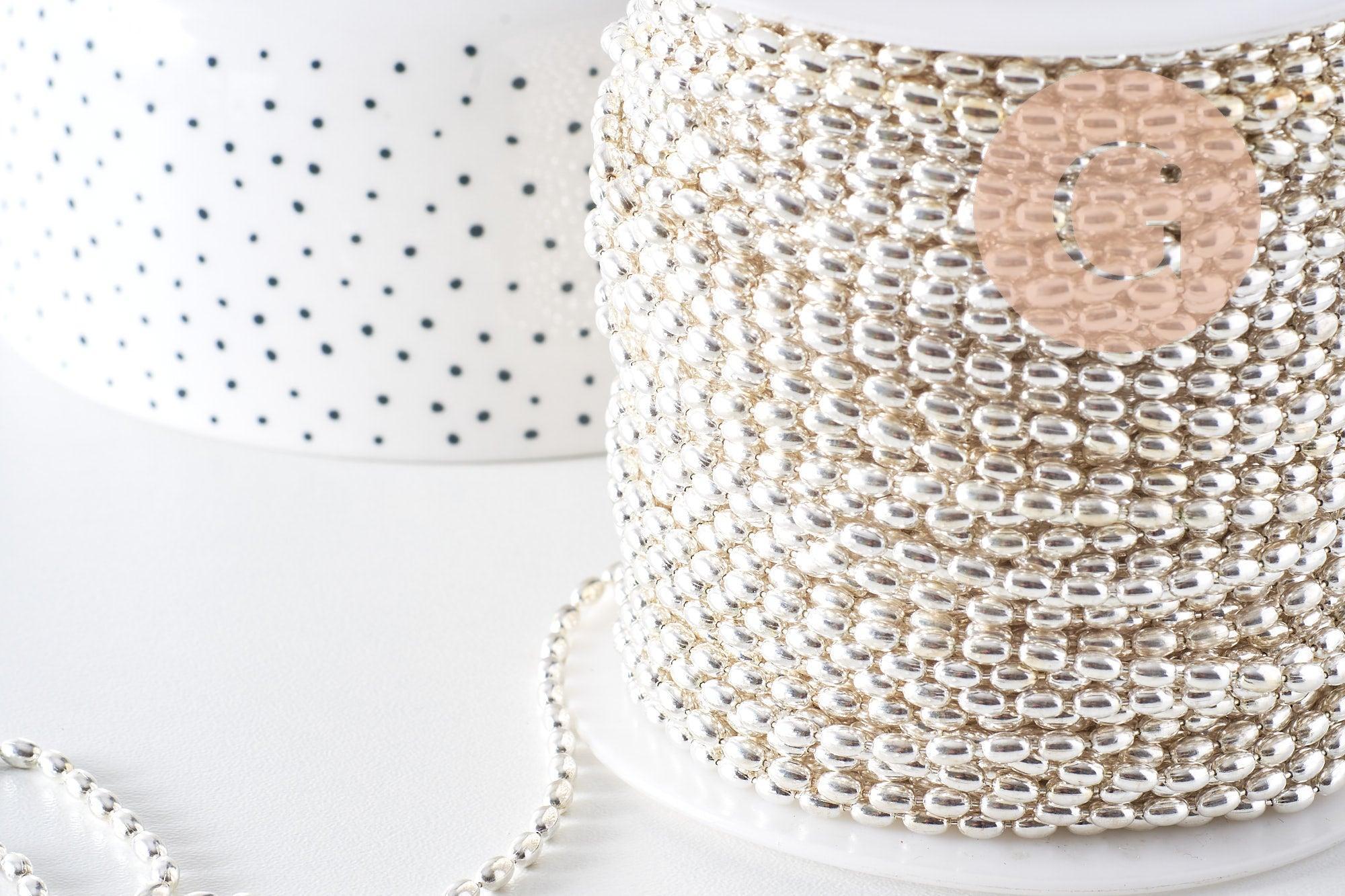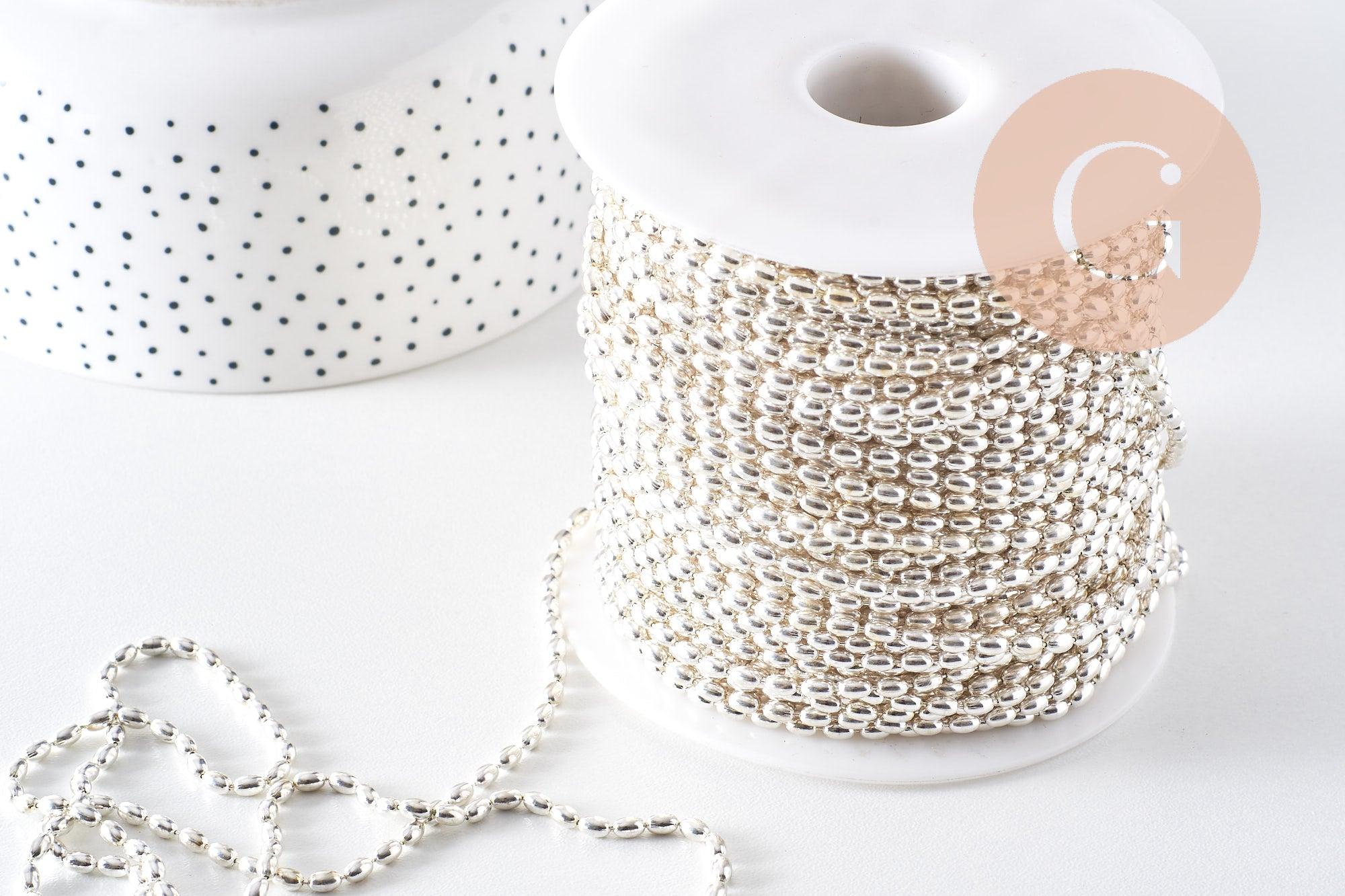 Bola fina ovalada de latón platino , perfecta para todas tus creaciones de joyería DIY. Muy femenina, esta elegante cadena está formada por pequeñas bolas unidas entre sí, ideal para collares finos, pulseras o incluso para colgar colgantes ligeros.
