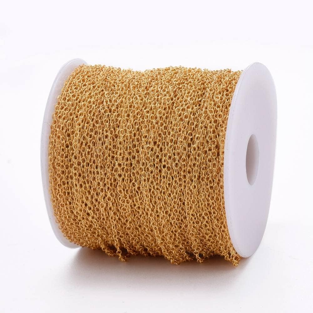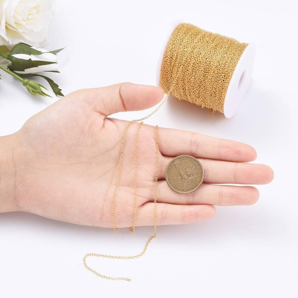 Una fina cadena de metal de color dorado - nueva bobina de 92 metros para hacer tus collares, pulseras, gargantillas, pendientes y otras joyas. ¡No hay límite para tu creatividad!