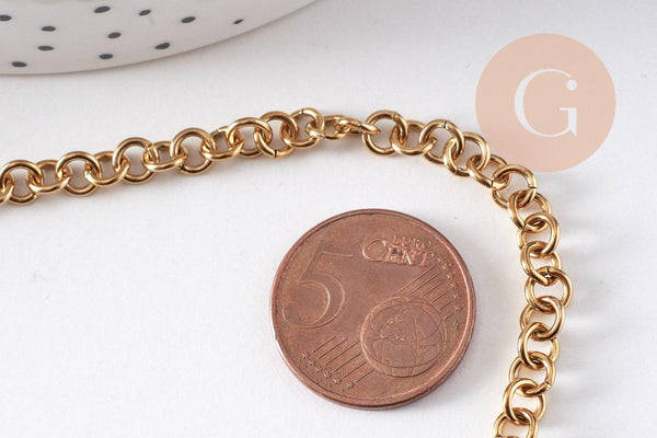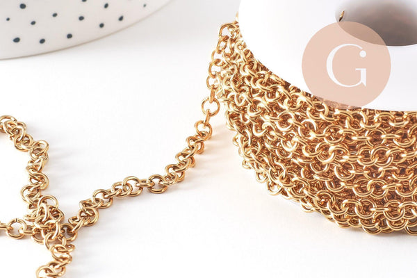 Cadena de malla rollo en acero inoxidable bañado en oro IP 18K , una cadena robusta y elegante ideal para tus creaciones de joyería DIY. Su malla redonda de 5 mm ofrece un aspecto moderno y asertivo, perfecto para crear piezas fuertes y de tendencia.