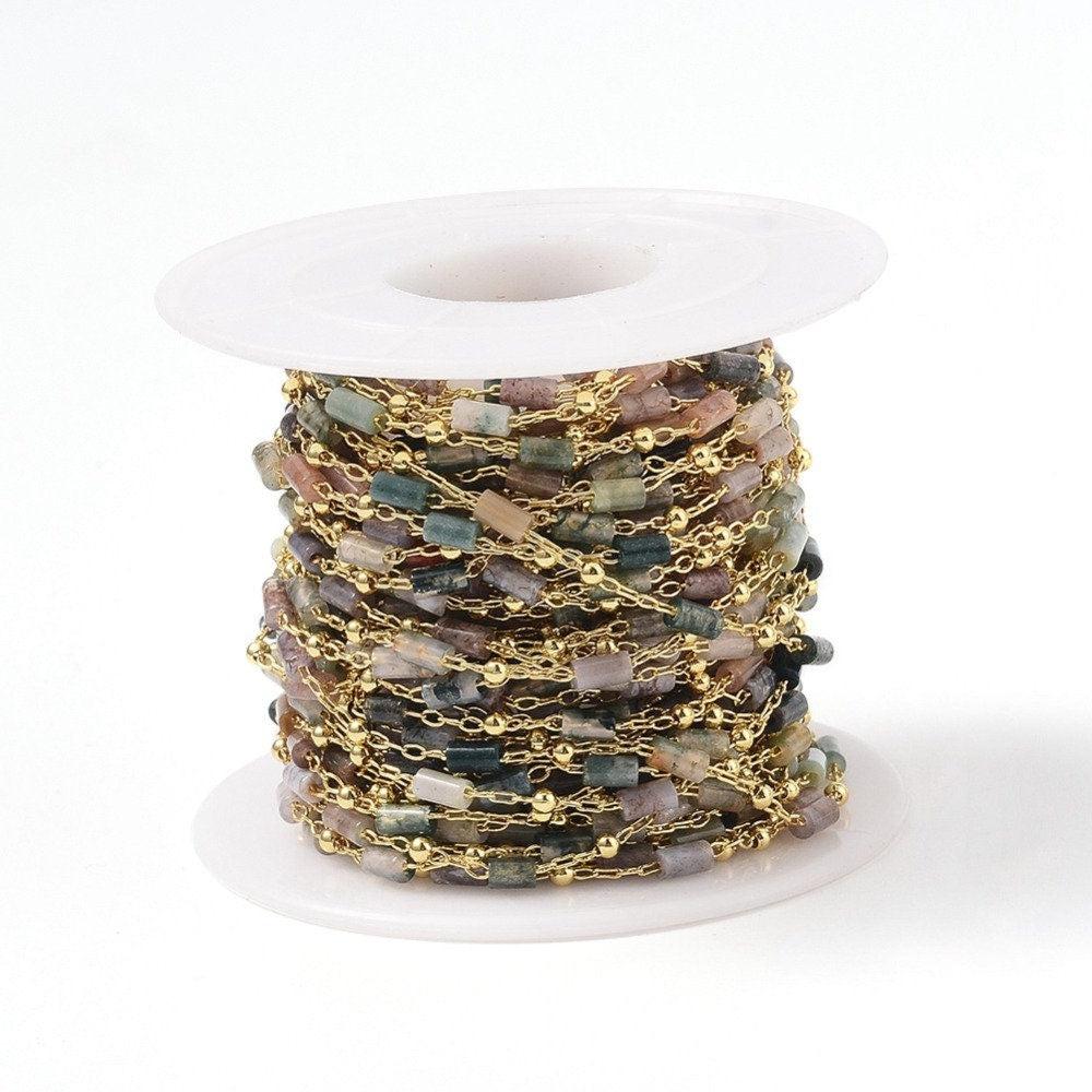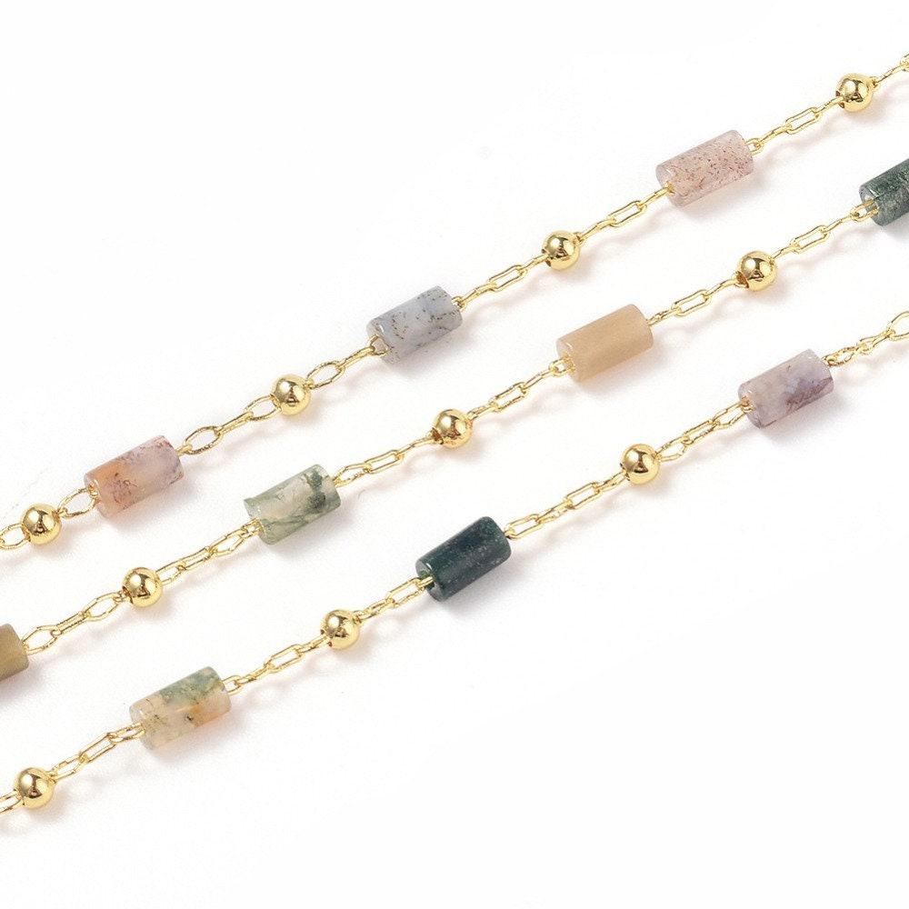 Para realizar bonitas cadenas para joyas o gafas, Gingerlily te ofrece esta cadena de cuentas elaborada con tubo de ágata musgosa natural y latón bañado en oro de 18 quilates.