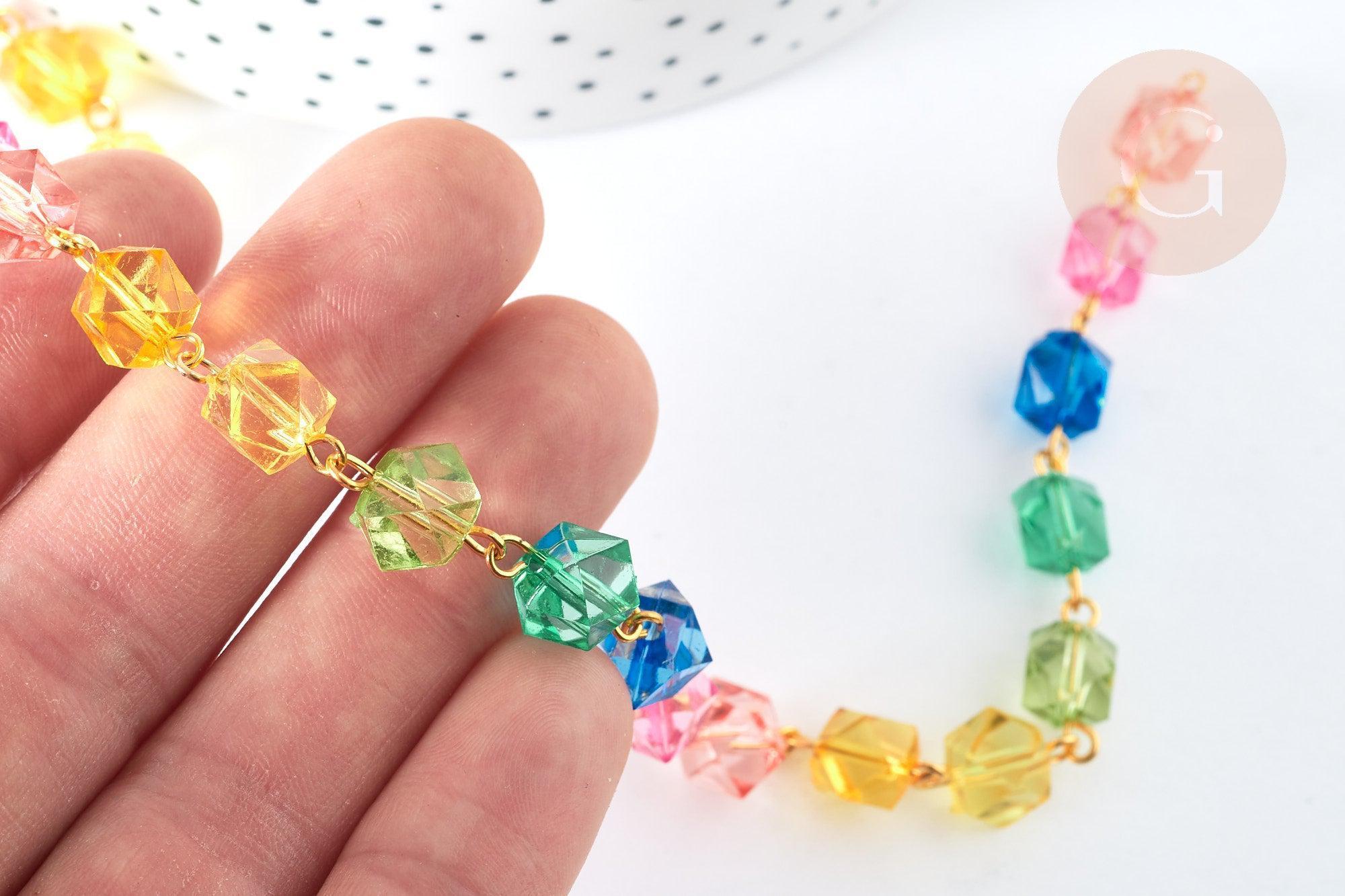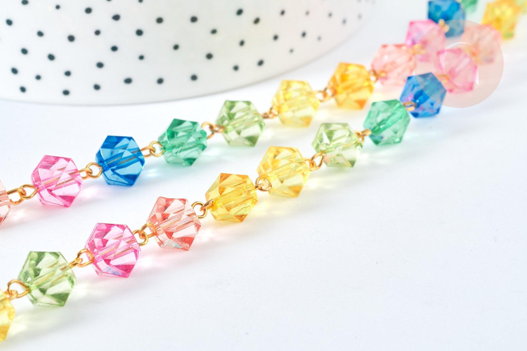 Adopte esta cadena de hierro dorada , vendida por metro. Éste está compuesto de cuentas acrílicas en forma geométrica facetada y color mezclado. ¡Ideal para añadir vitaminas a tu vida!