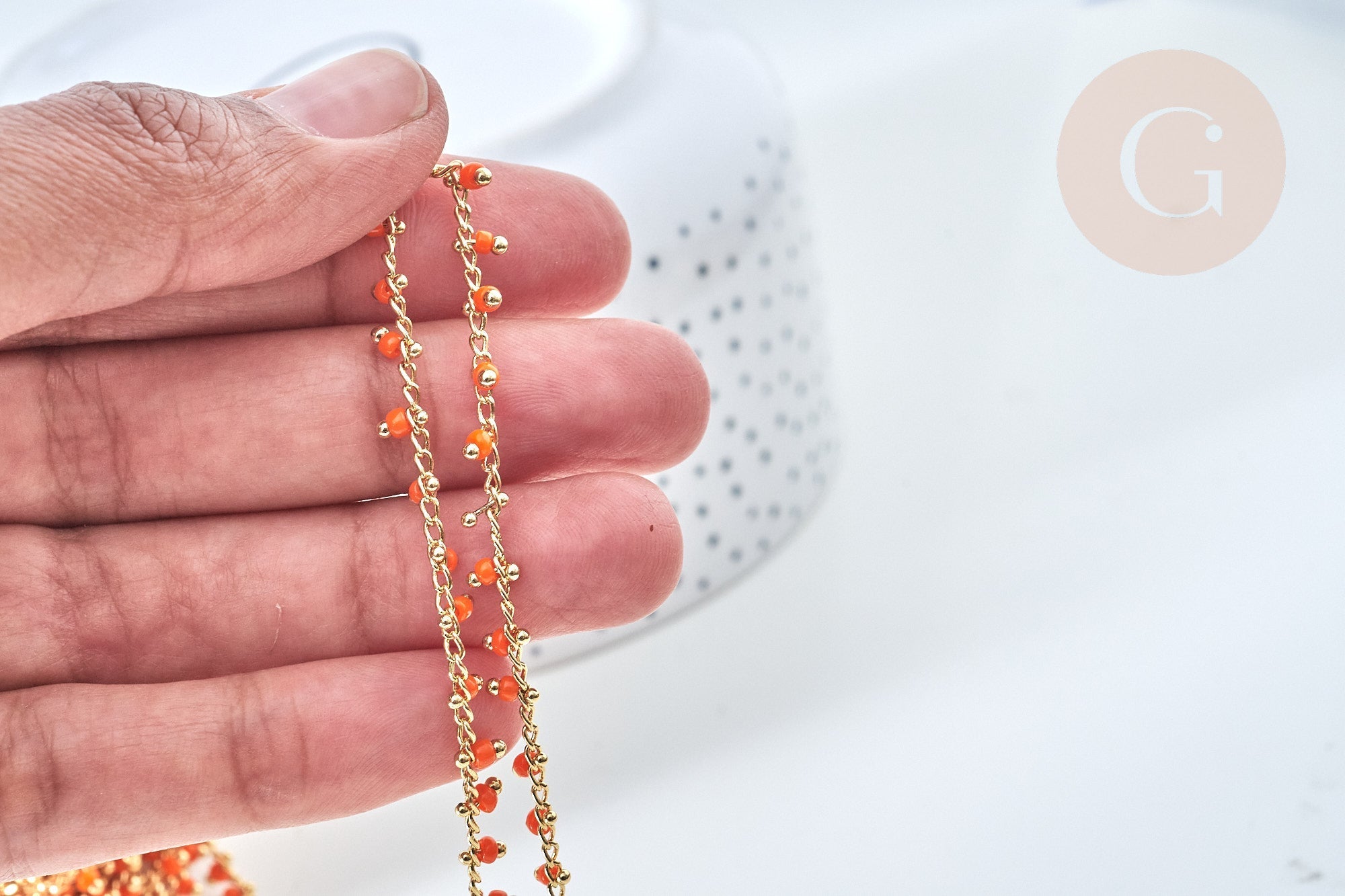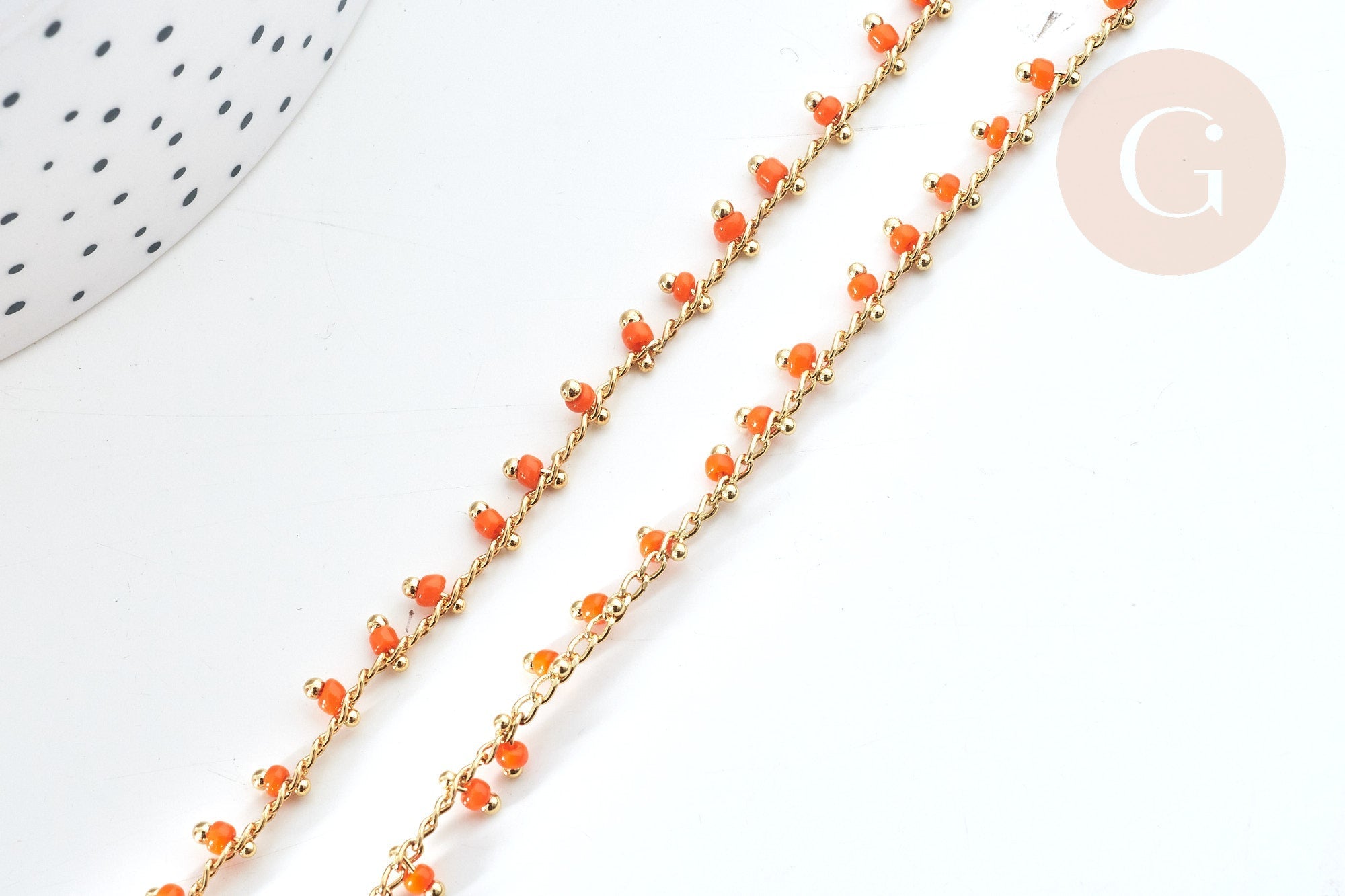 Para hacer bonitas cadenas de bisutería o de gafas DIY , Gingerily le ofrece esta cadena de cuentas de latón dorado con sus cuentas de semillas de color rojo anaranjado .