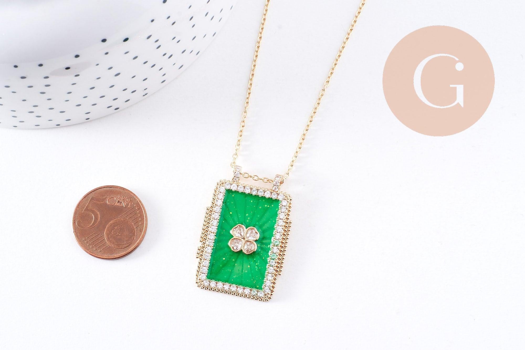Un elegante amuleto de la suerte, este collar presenta un medallón de zamac esmaltado en verde y bañado en oro, adornado con brillantes circonitas blancas. Montado sobre un refinado cordón trenzado, combina elegancia y simbolismo para realzar cualquier look.