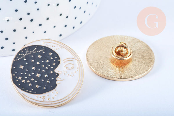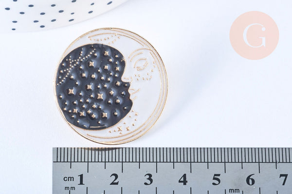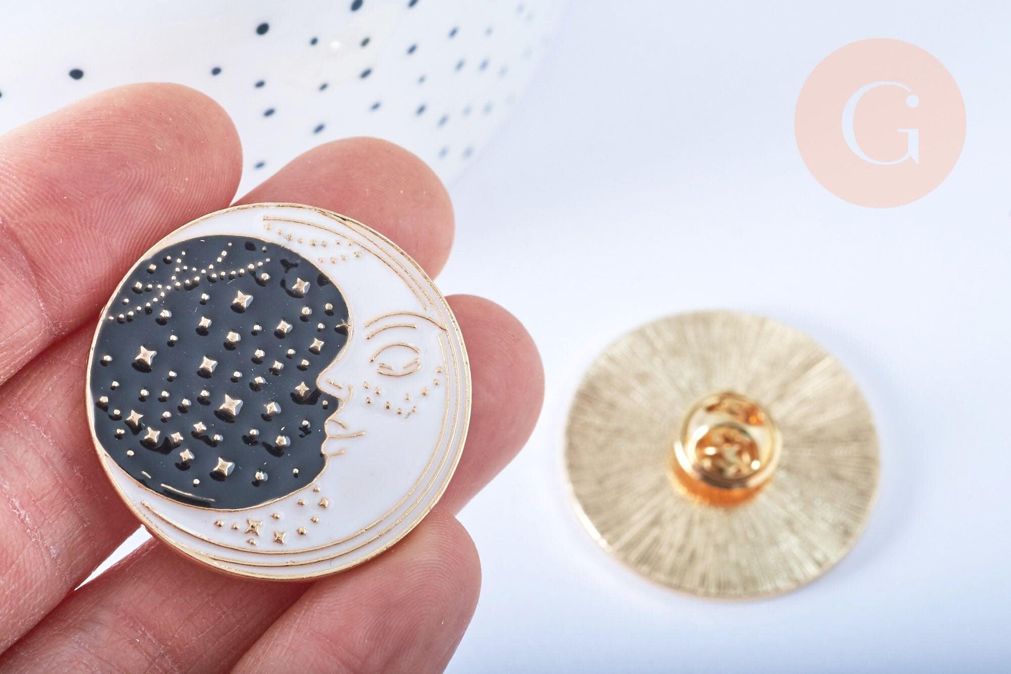 Te ofrecemos este encantador broche Pin de luna creciente sobre fondo de cielo estrellado, motivo místico de amuleto de la suerte, en zamac bañado en oro y esmalte de color.