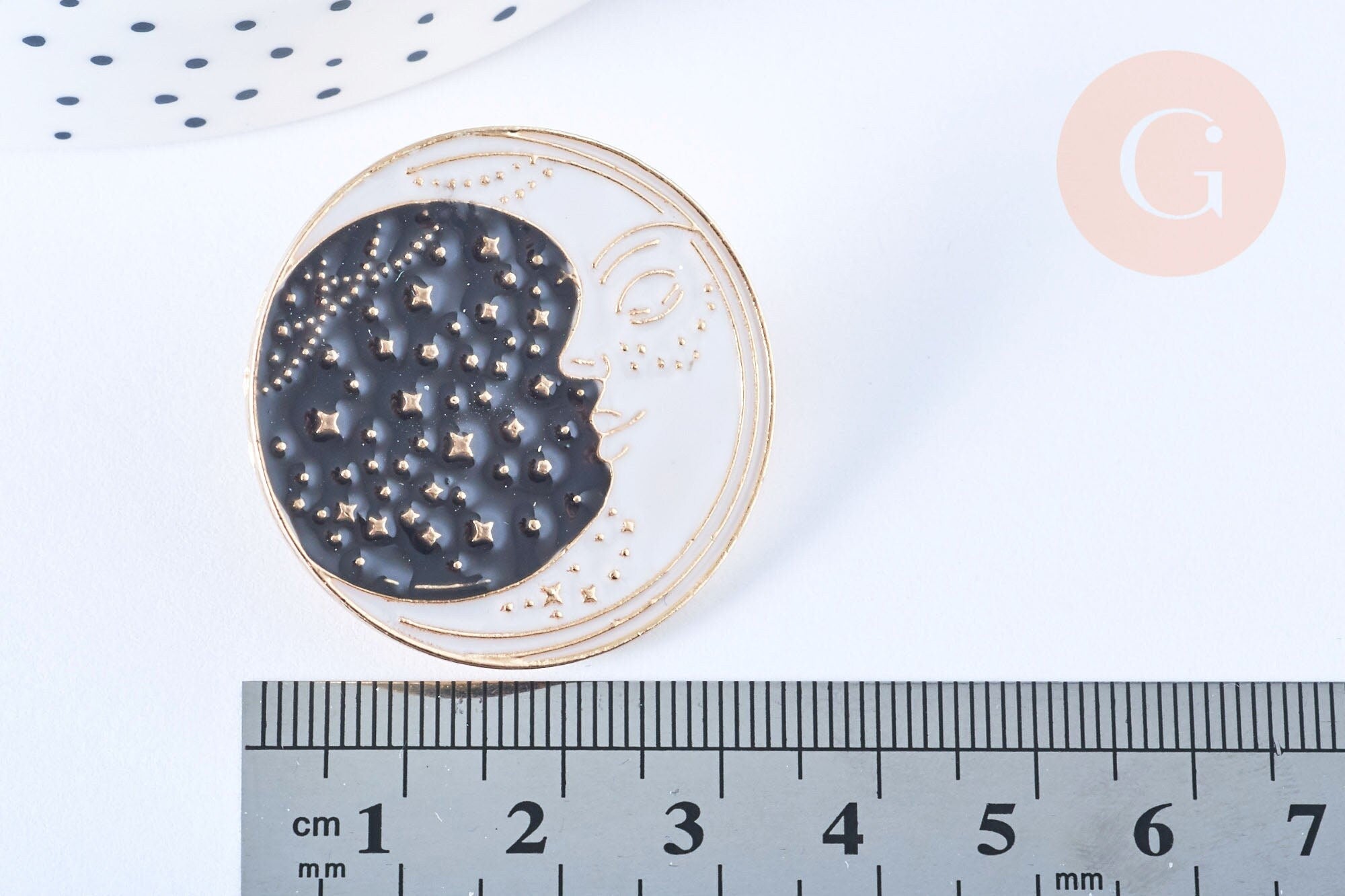 Descubre el místico broche de media luna, adornado con esmalte negro y acabado dorado, una pieza decorativa de 35 mm que añadirá un toque de elegancia a tu chaqueta o cualquier otra prenda.