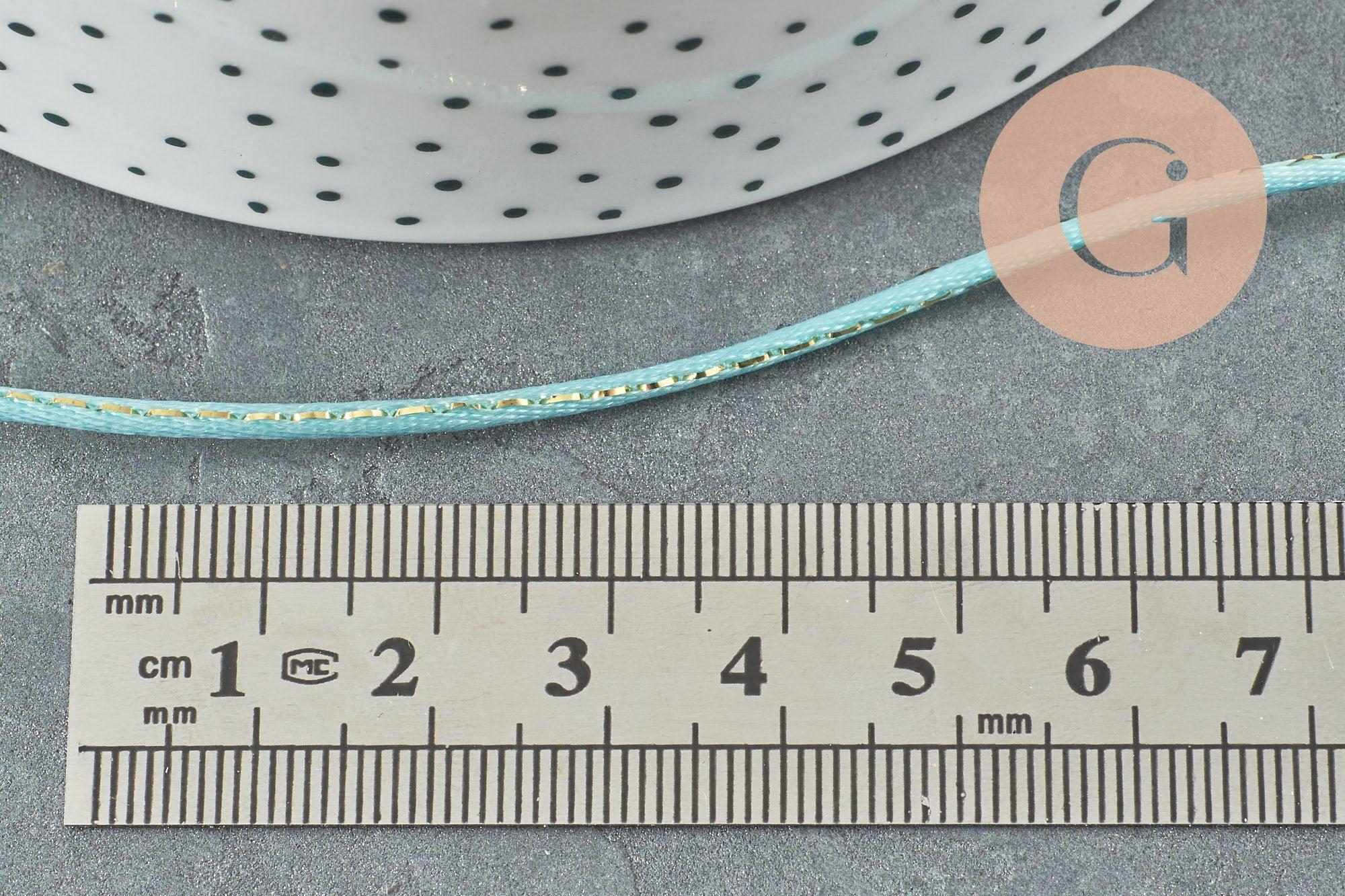 Para realizar tus joyas, complementos, bolsos y ropa o para realizar scrapbooking y otras aficiones creativas, te ofrecemos 1 metro de cordón de nailon azul claro realzado con un hilo dorado.