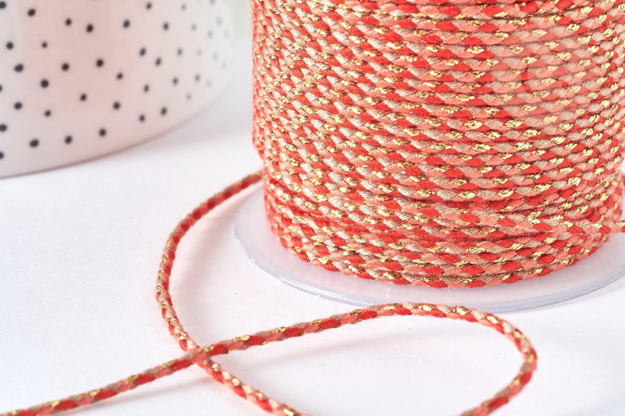Este cordón de color naranja claro, oscuro y dorado está hecho de tres hilos de poliéster de colores trenzados con un hilo metálico dorado. Un cordón ideal para hacer joyas , accesorios , bolsos y ropa o para álbumes de recortes y otros pasatiempos creativos .
