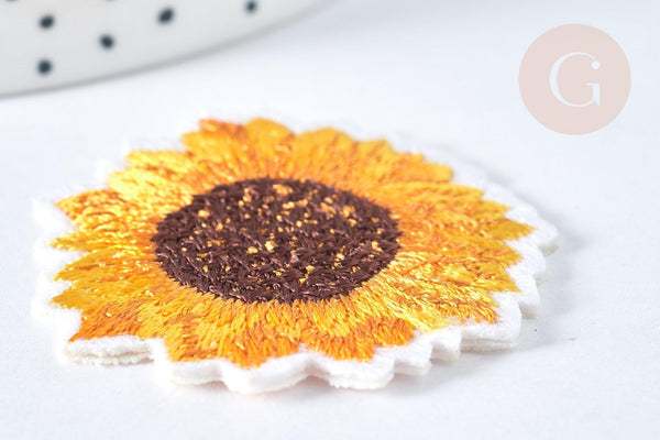 Ecusson brodé Tournesol thermocollant jaune 44mm, x1 (G7436)