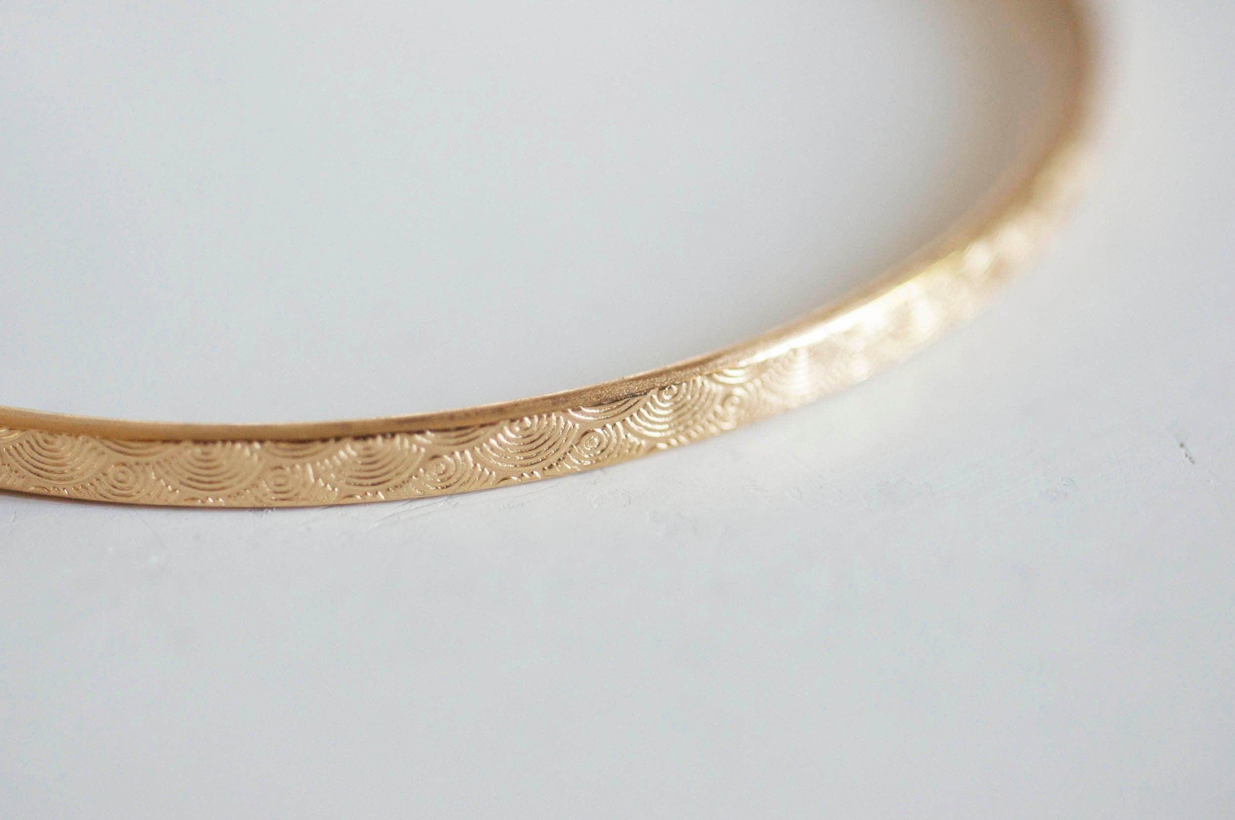 Pulsera de acero bañada en oro grabada, pulsera bañada en oro, creación de joyas, pulsera de acero quirúrgico, sin níquel, pulsera de acero bañada en oro, 66 mm Un fino brazalete de acero bañado en oro, con un fino grabado...