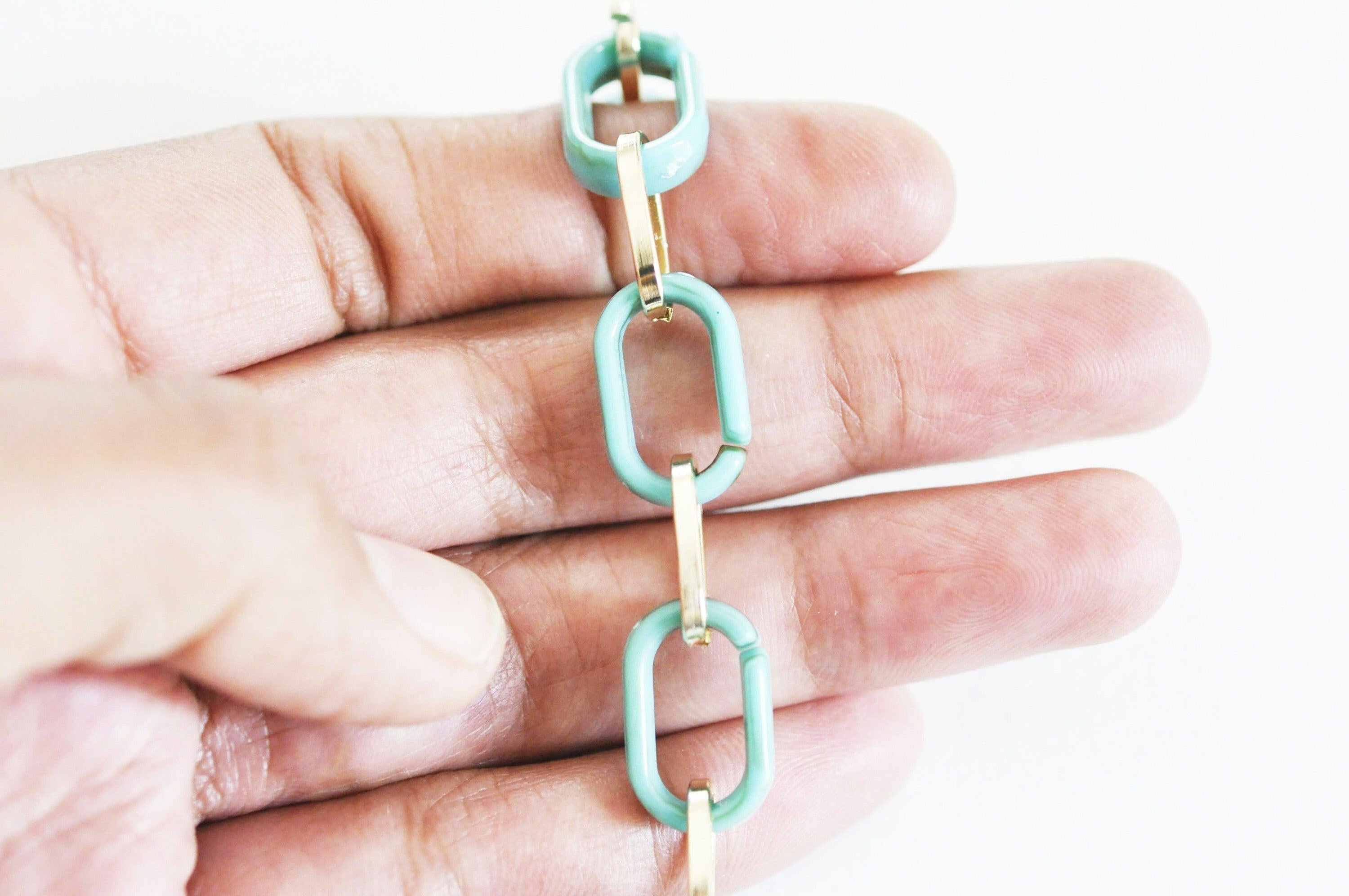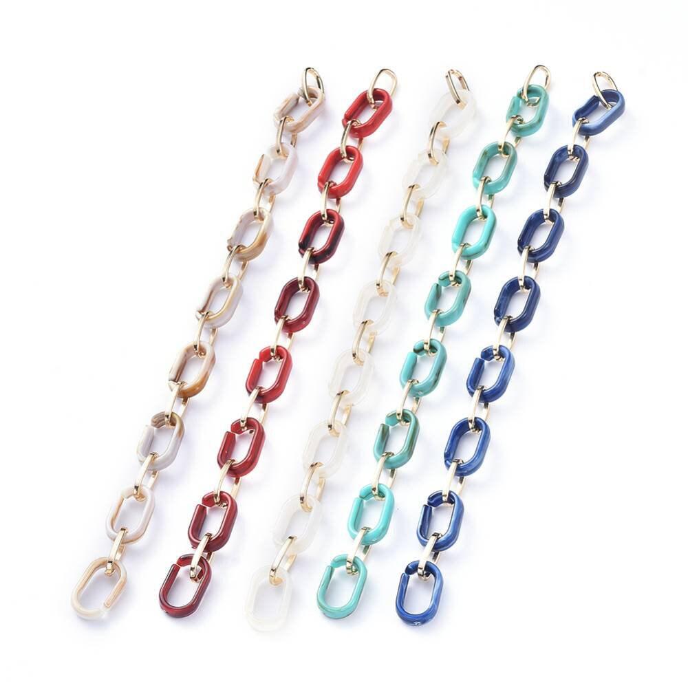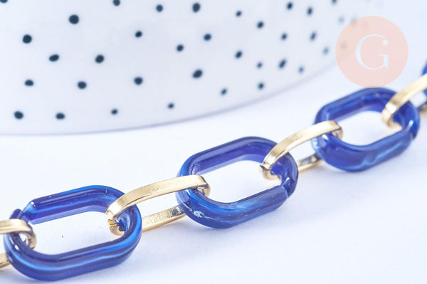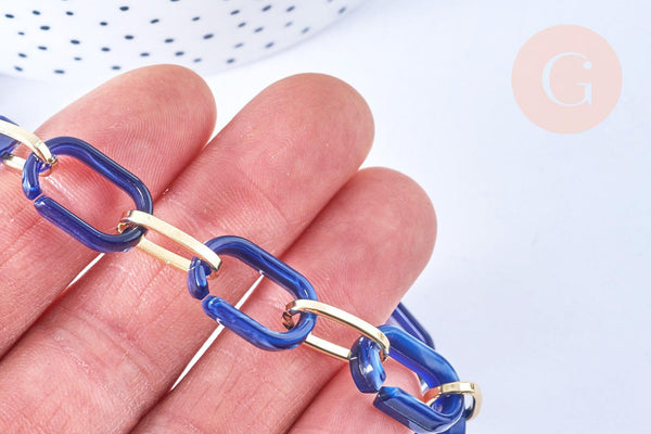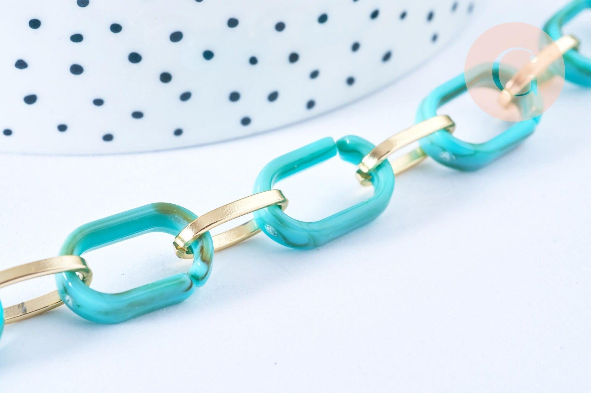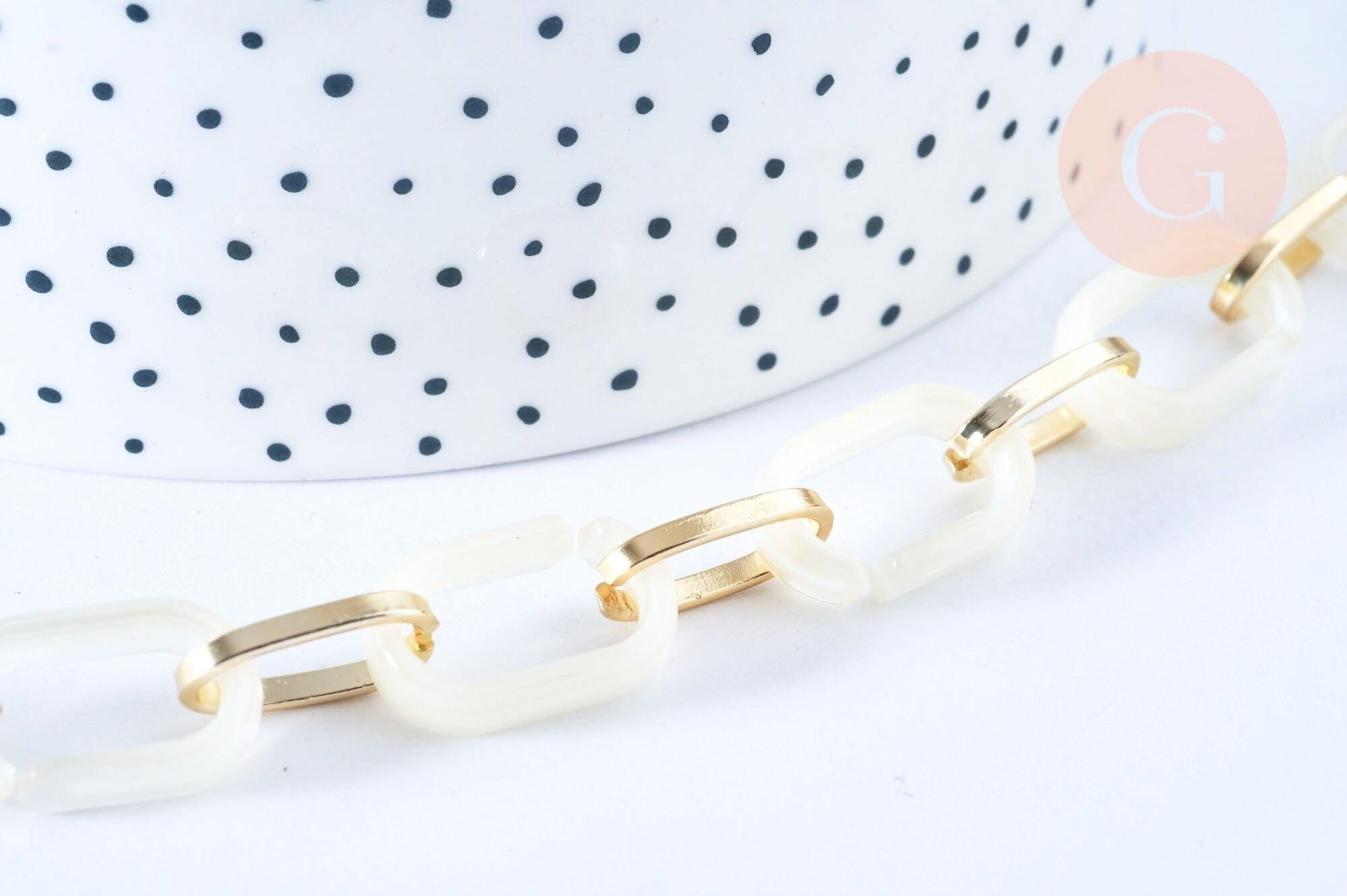 Esta cadena combina la ligereza del acrílico y el brillo del metal chapado en oro , para lograr un aspecto sofisticado sin dejar de ser cómoda de llevar.