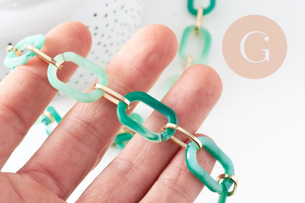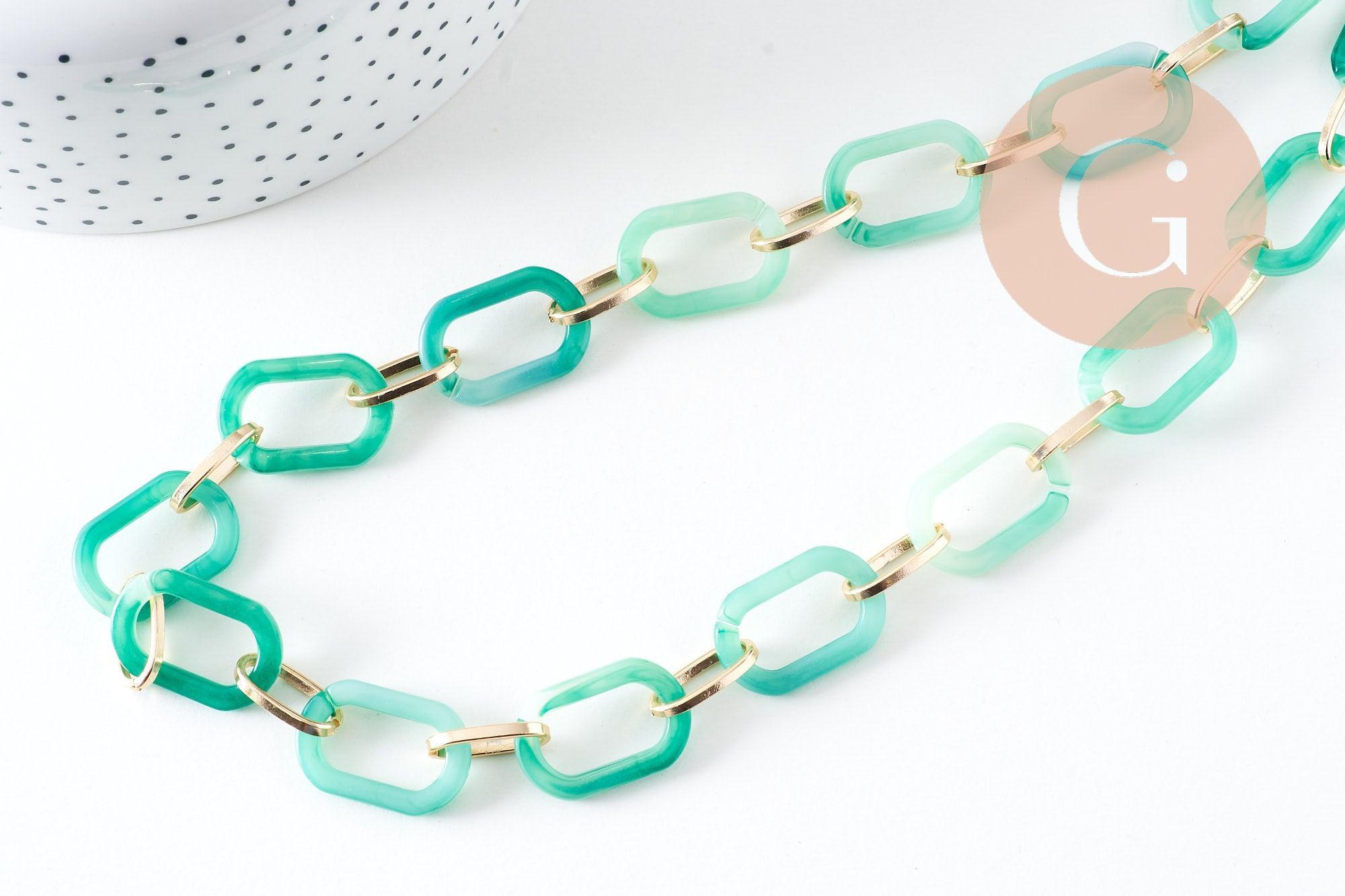 Una gran cadena de plástico acrílico verde y un eslabón de aluminio dorado texturizado para crear joyas modernas y originales.