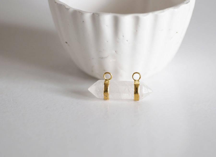 Déjese seducir por este colgante de cristal de roca con soporte dorado con doble anilla Podrás crear magníficos collares con este colgante tan de moda. El cristal está cortado en forma de punta. Ancho: 14 mm Longitud: 32 mm Diámetro:...