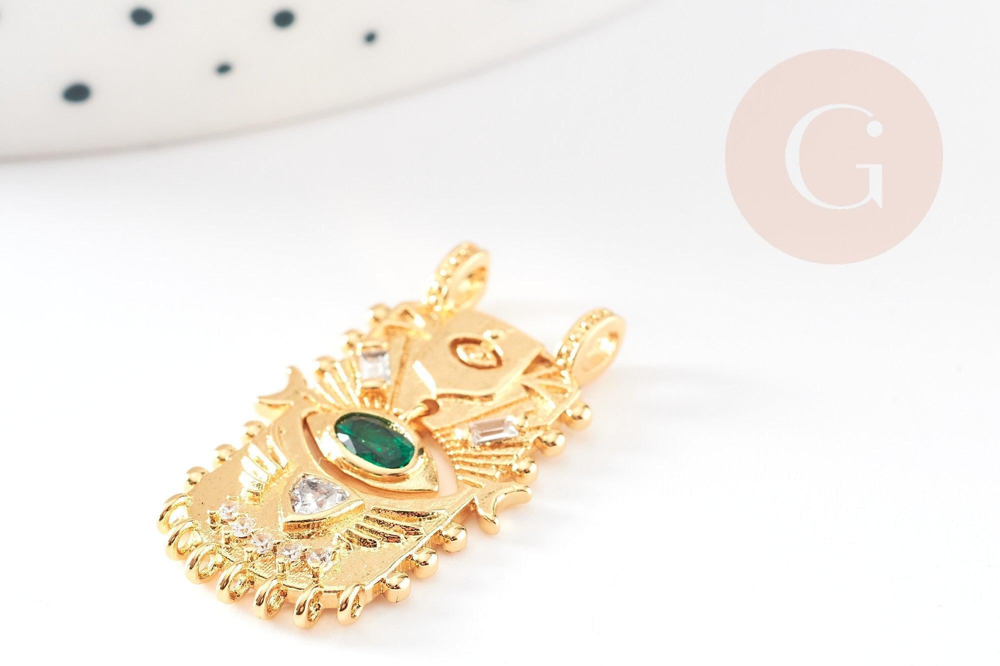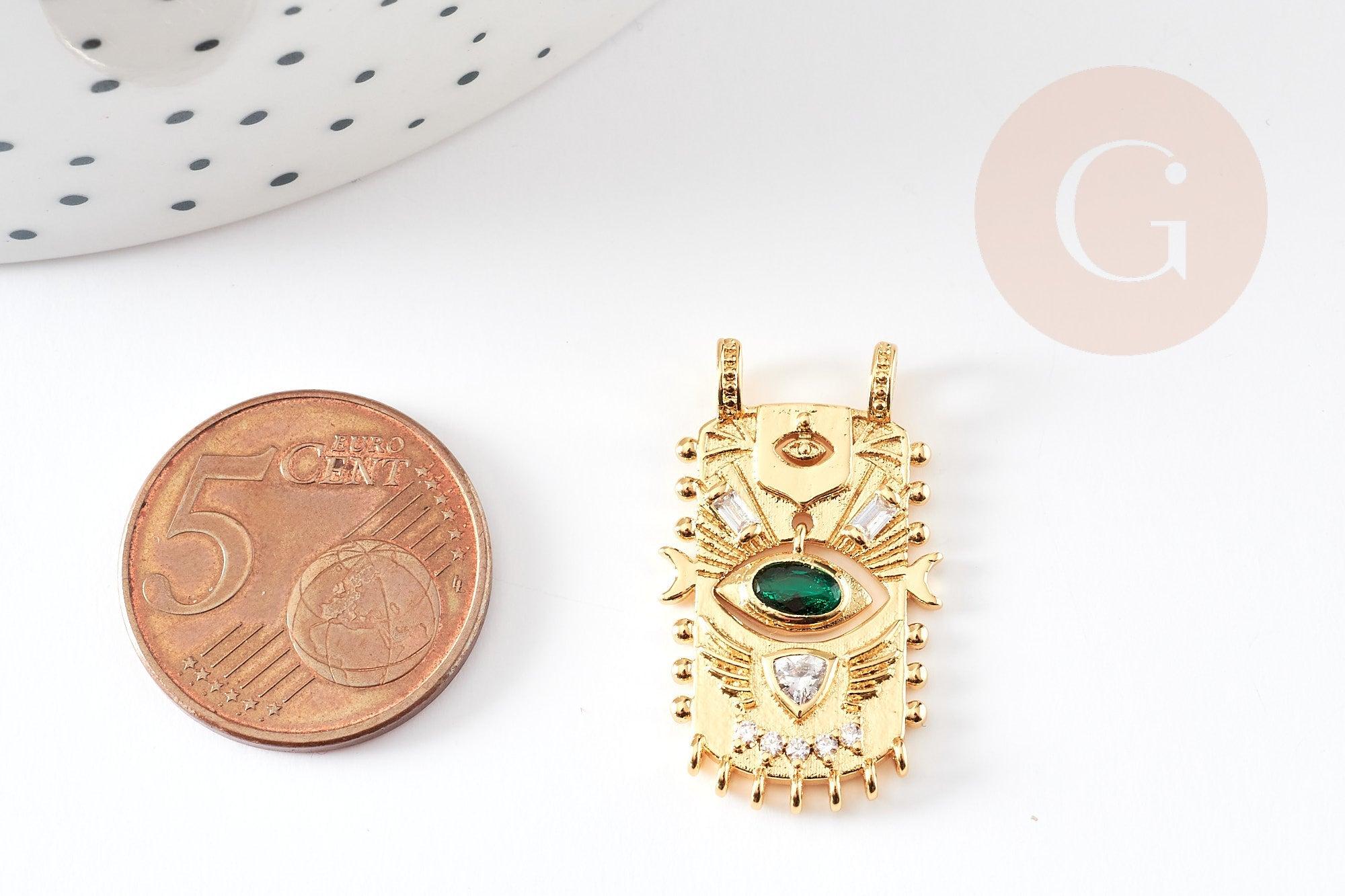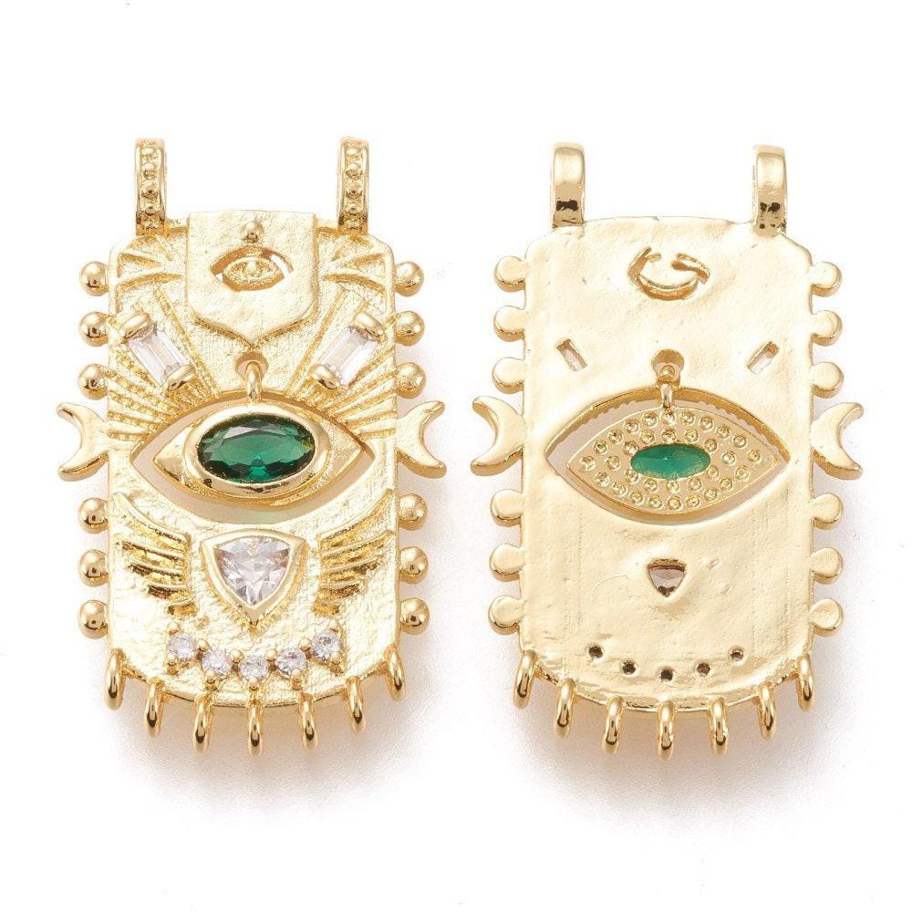Un magnífico colgante rectangular en oro de 18 quilates, adornado con un ojo protector de cristal verde .