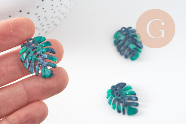 Pendentif acétate feuille monsterosa verte, perles plastique,connecteur feuille plastique 27mm, x2 (G5067)