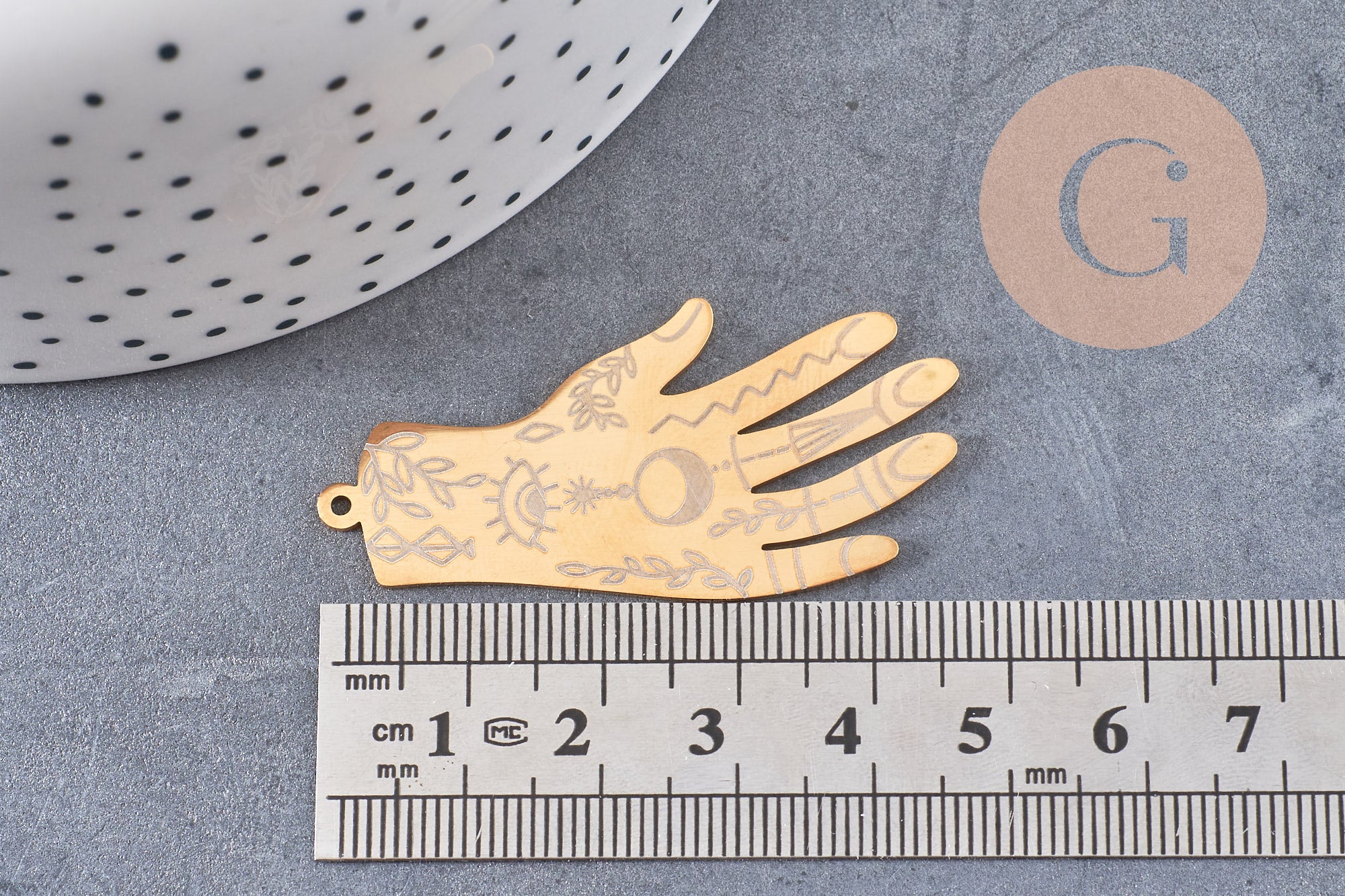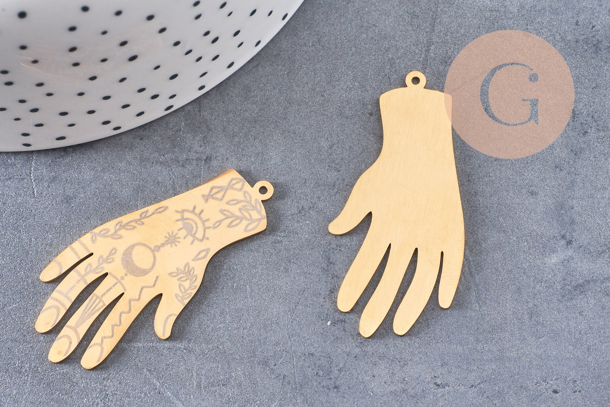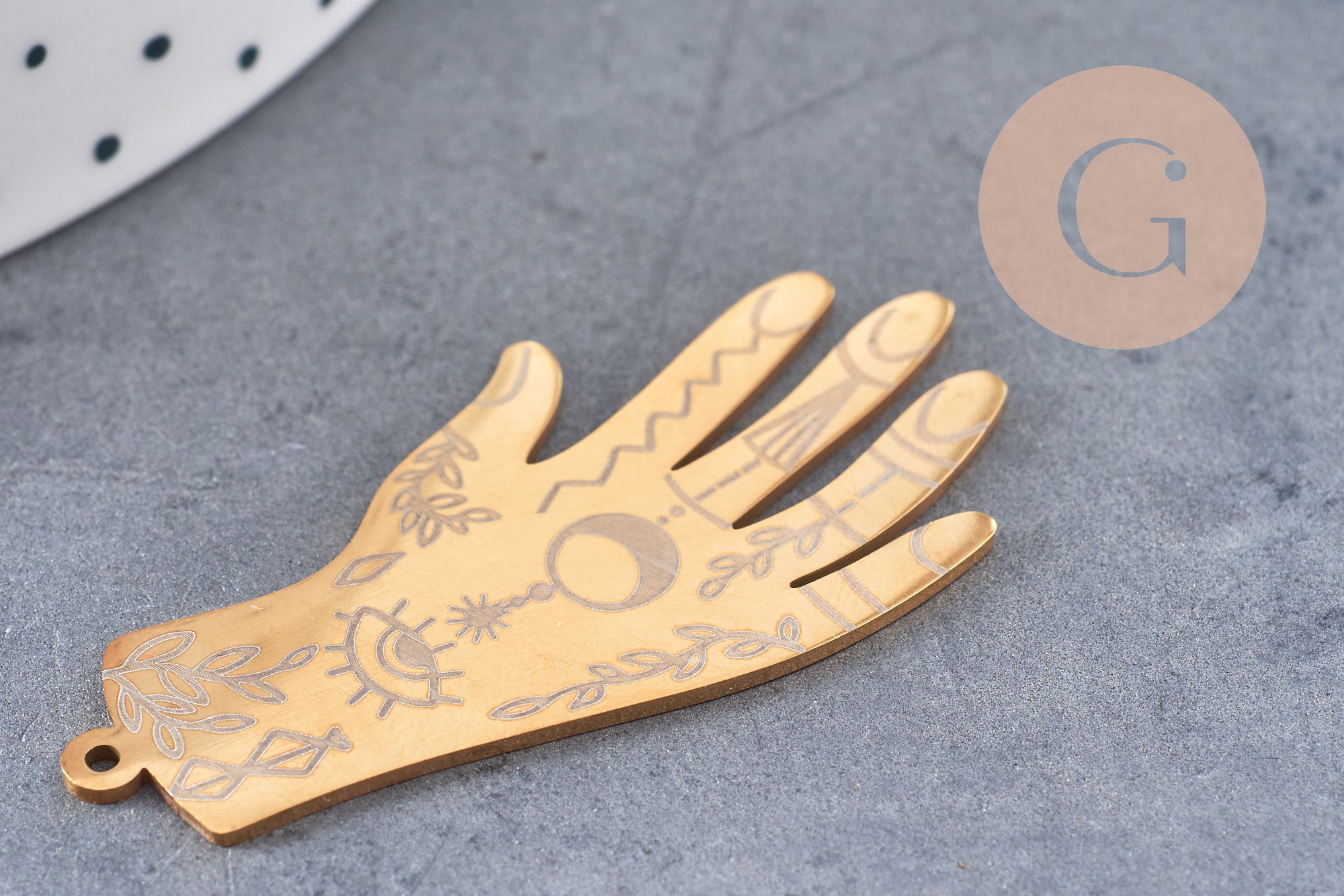 Para tus joyas de tendencia esotérica, aquí tienes un magnífico colgante en forma de mano en acero bañado en oro que podrás decorar con una piedra o perlas.