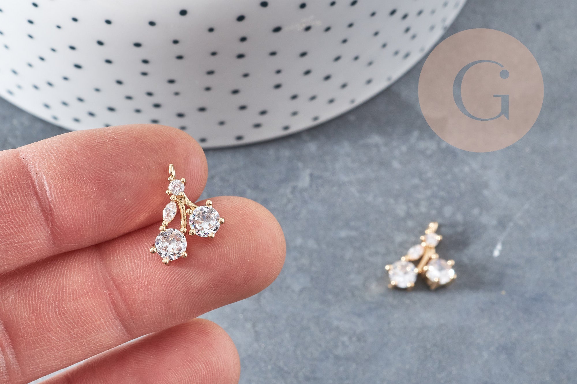 Crea un montón de bisutería DIY con este colgante de cereza de latón dorado , decorado con cristales de circonita blanca . Un amor de colgante. Los circones siguen la forma de la fruta.
