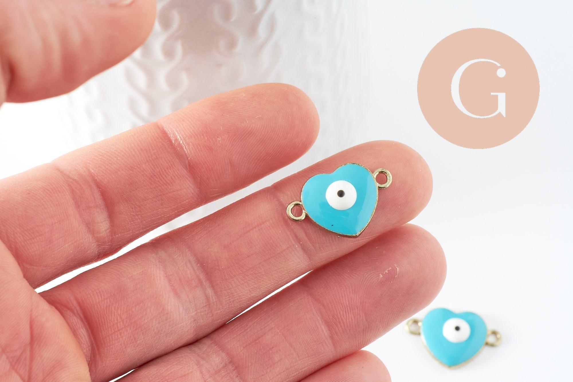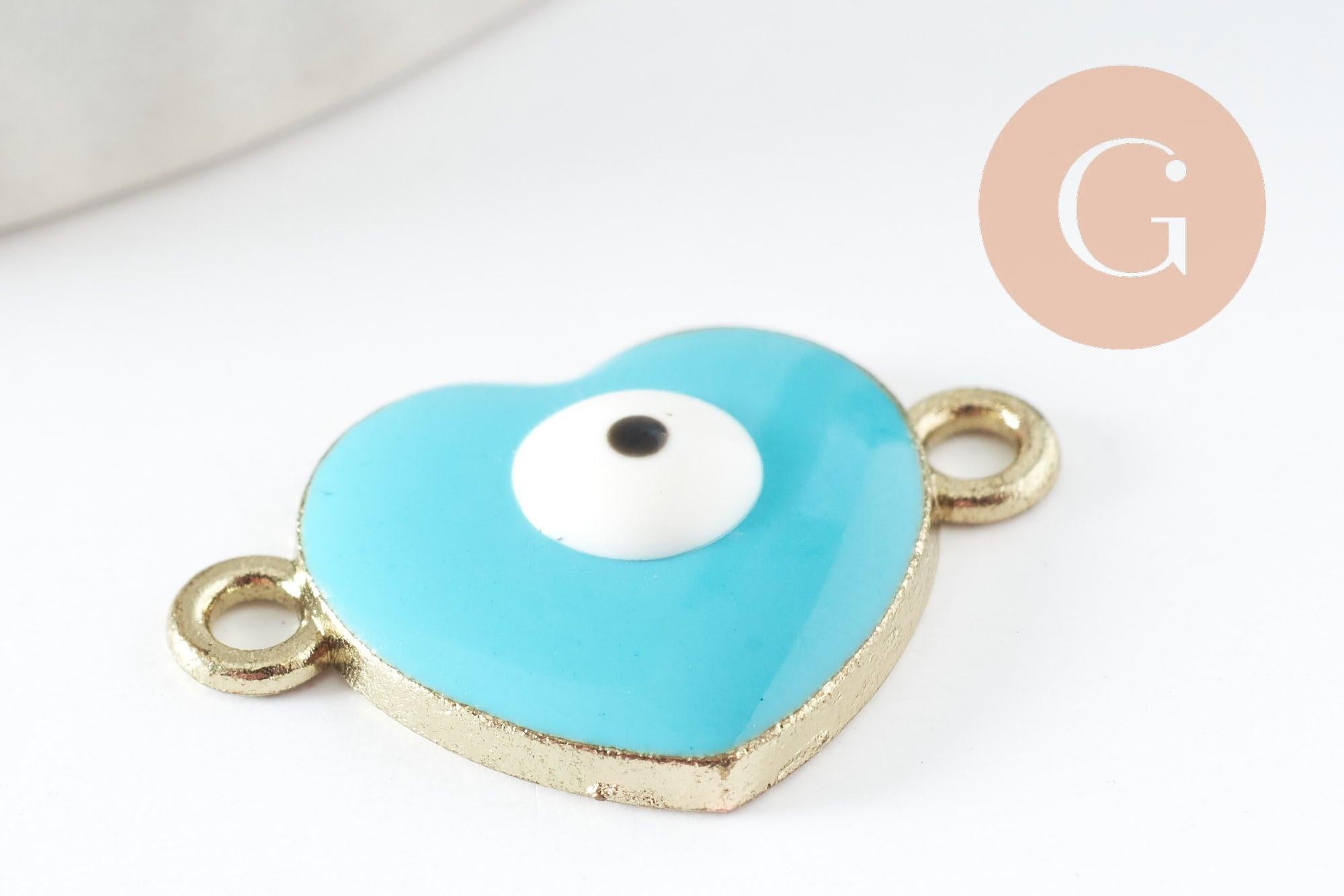 Un lindo colgante conector dorado que representa un corazón contra el mal de ojo, dorado y esmaltado con resina azul turquesa, para hacer collares y pulseras de la suerte.
