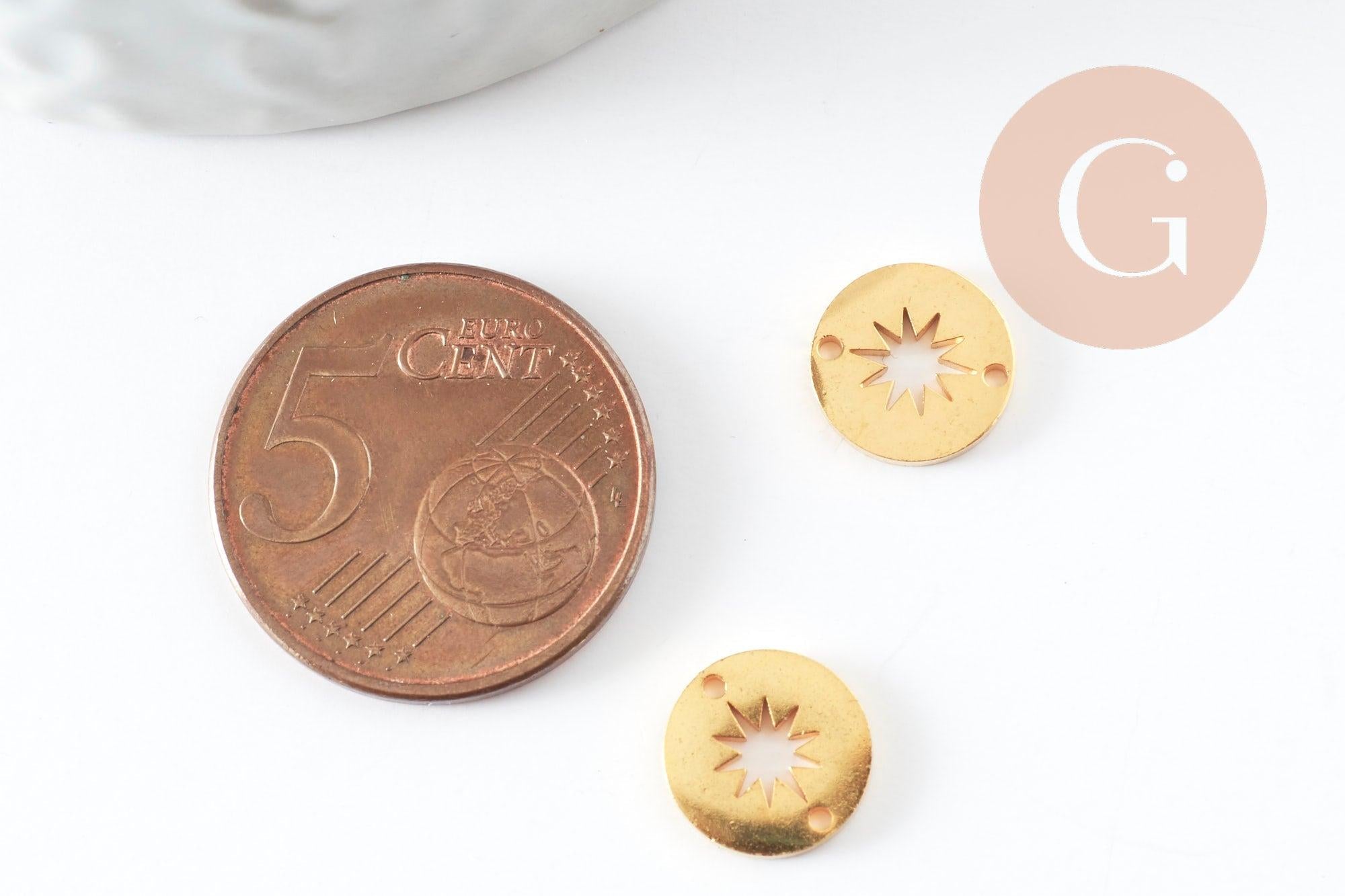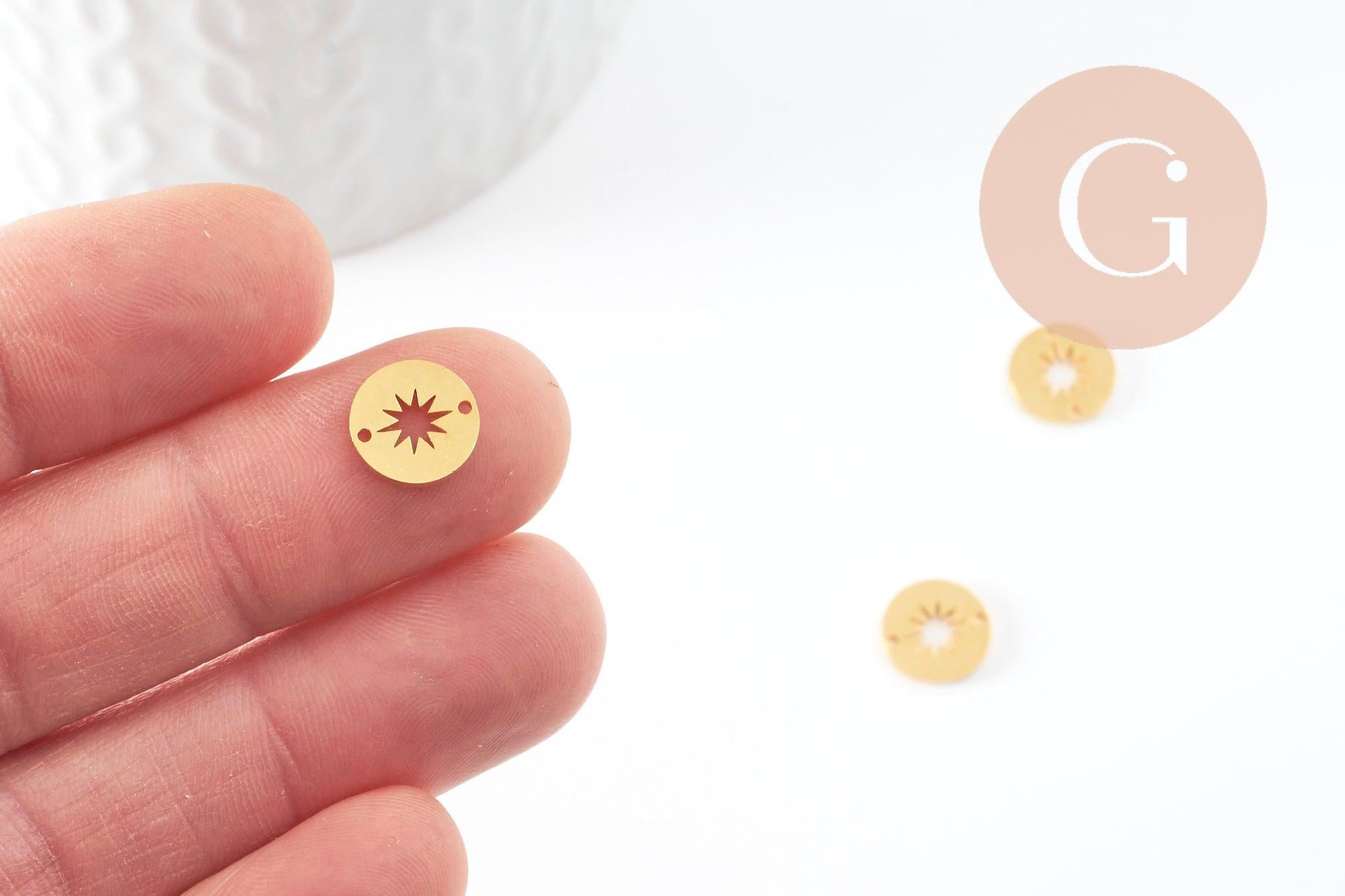 Añade un toque brillante y elegante a tus diseños con este colgante de conector redondo de acero inoxidable 304 en tono dorado, que presenta un motivo de sol ahuecado . Este conector es ideal para personalizar tus joyas como collares, pulseras, pendientes o accesorios de moda.