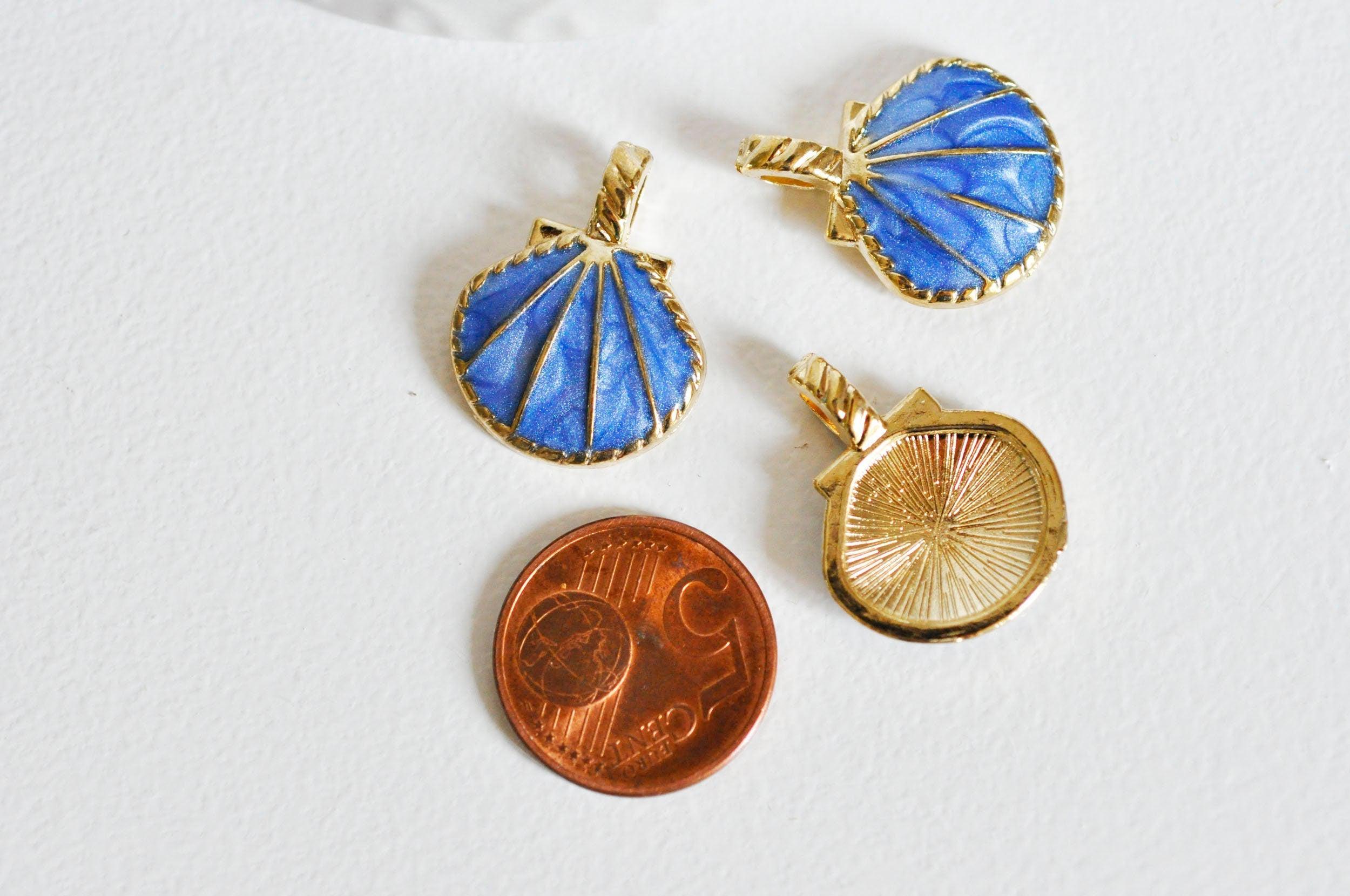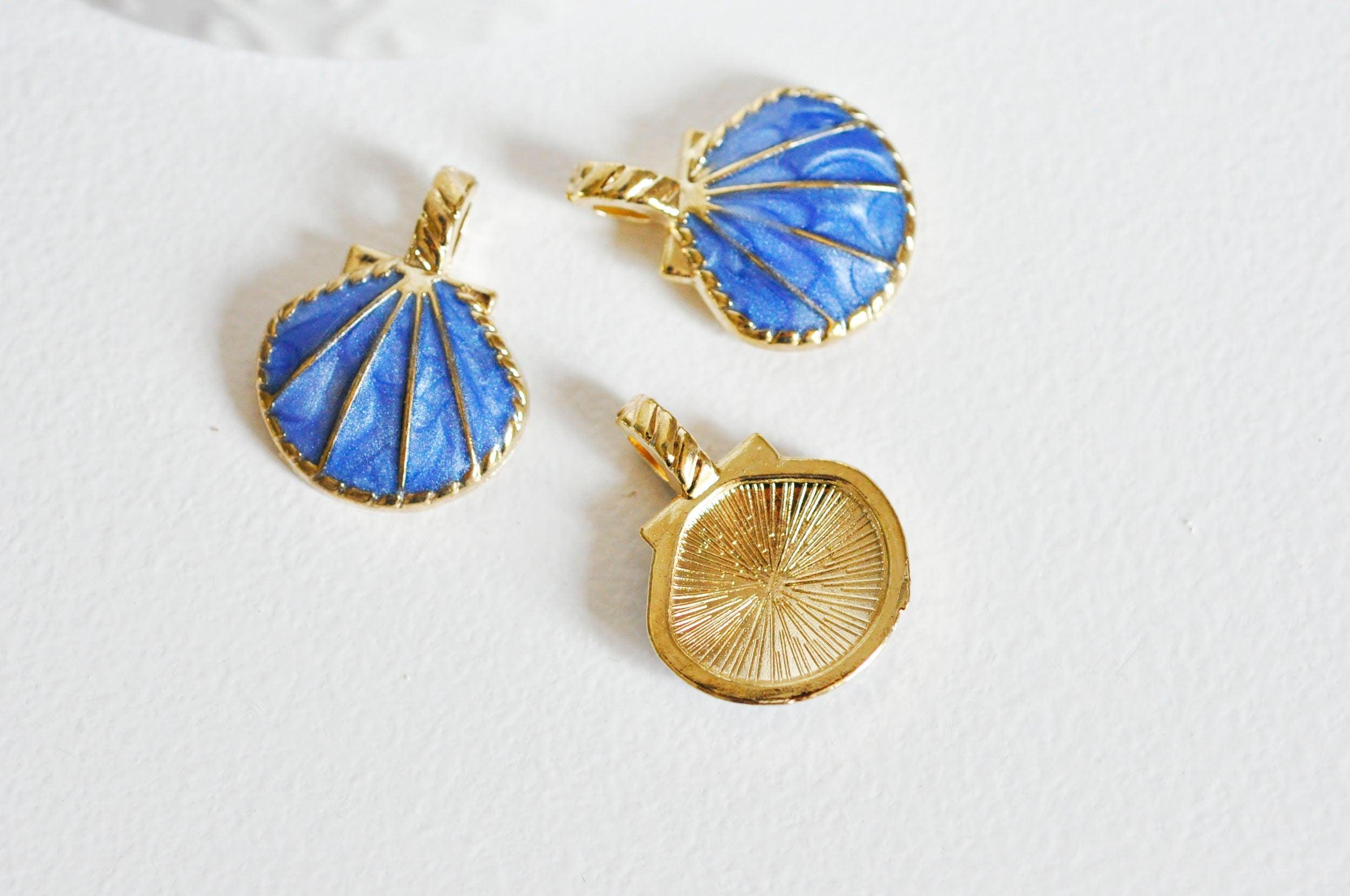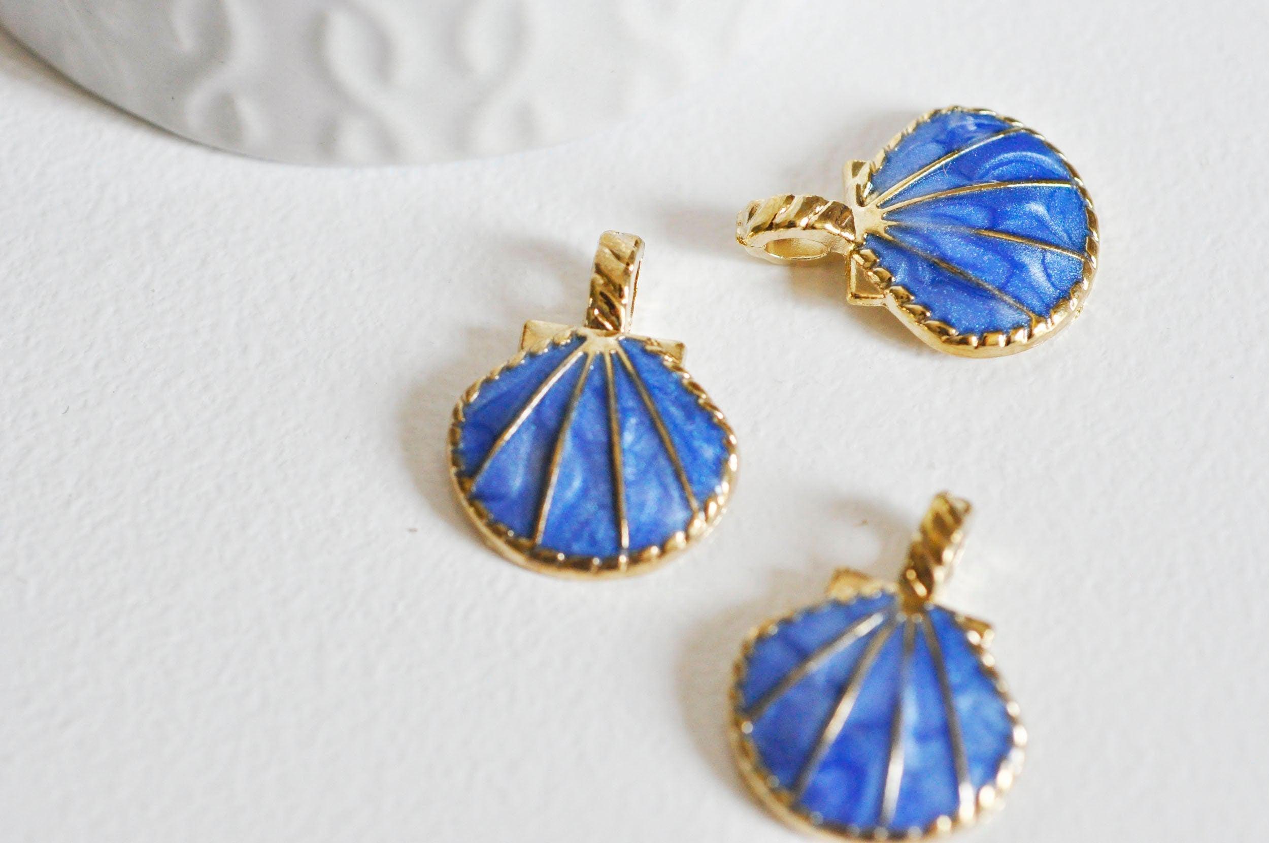 Colgante de concha dorada azul, suministro creativo, colgante de concha, creación de joyas, concha dorada, colgante dorado, 24,5 mm, juego de 2 2 conchas de metal dorado recubiertas de resina azul transparente. El anillo está situado en la parte superior...