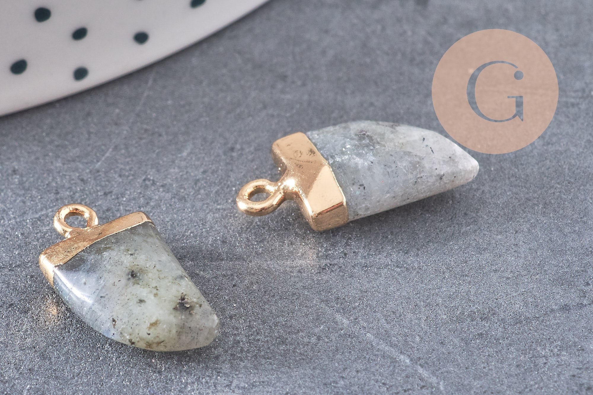 Realza tus creaciones con este colgante en forma de cuerno en labradorita natural , engastado con un soporte de latón bañado en oro .