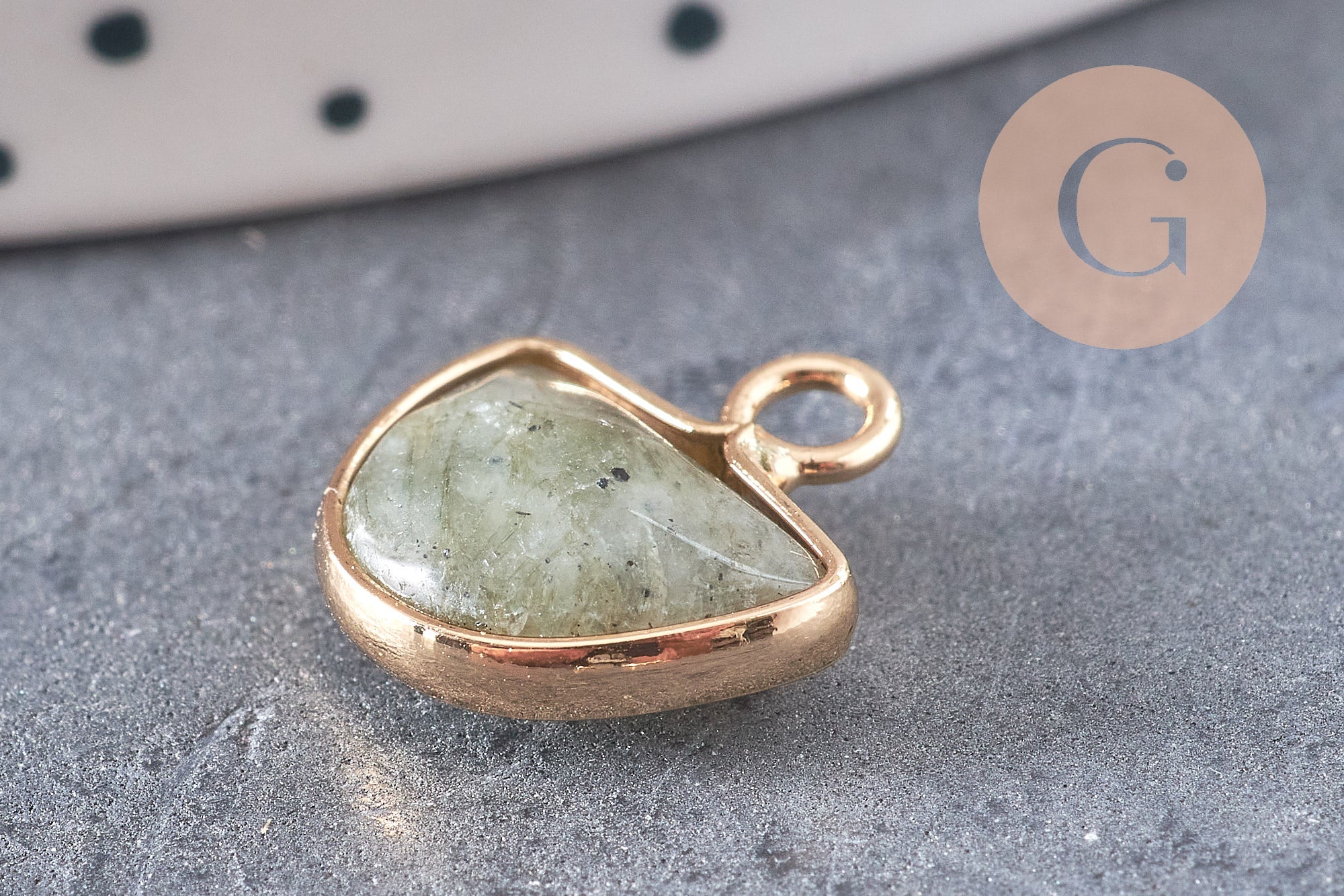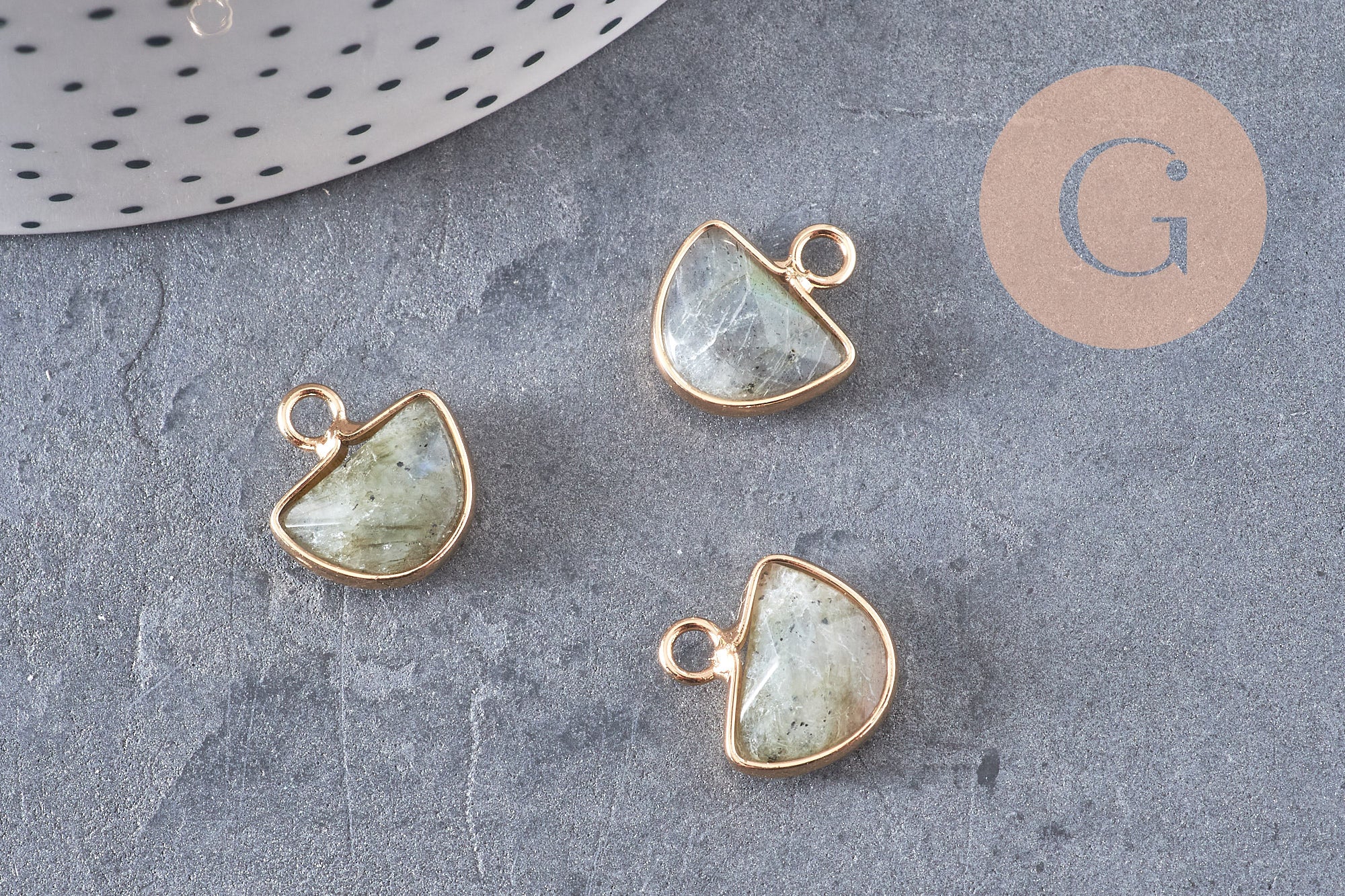 Déjese seducir por este pequeño colgante de labradorita gris con soporte dorado.