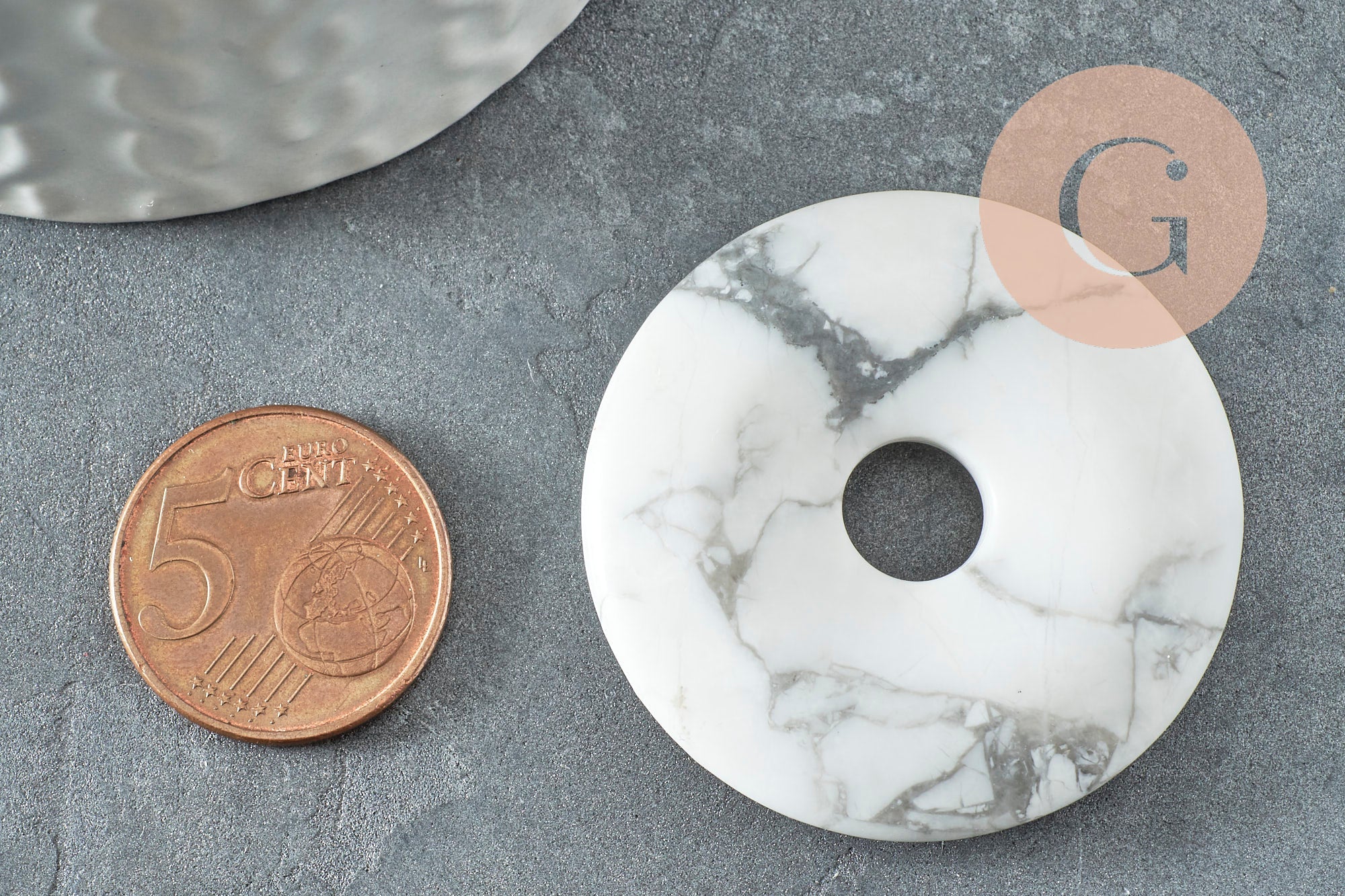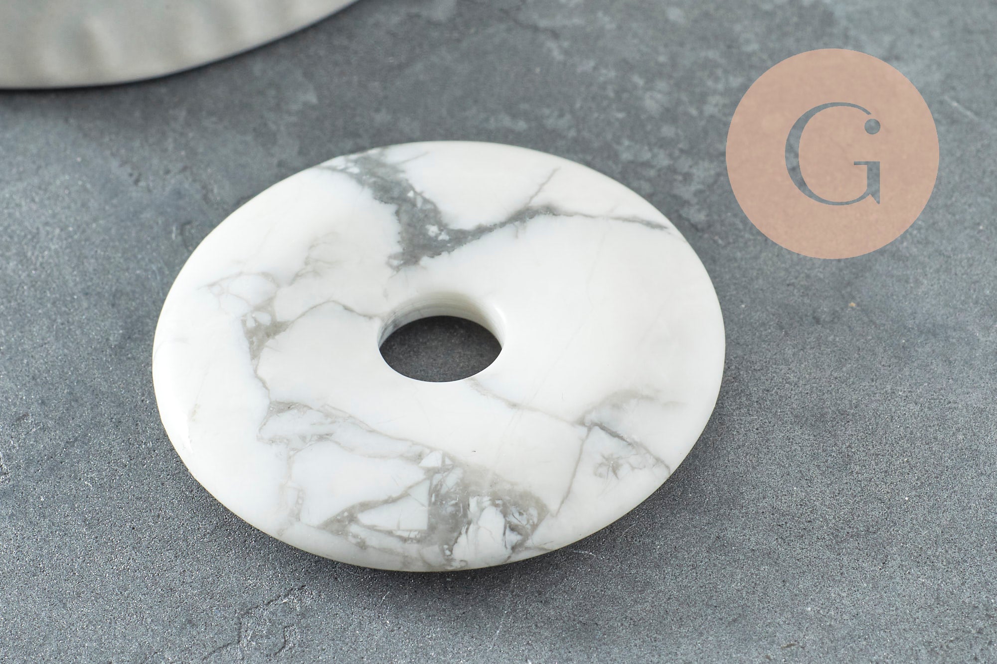 Déjate seducir por este pequeño colgante de howlita natural jaspeada en forma de donut.