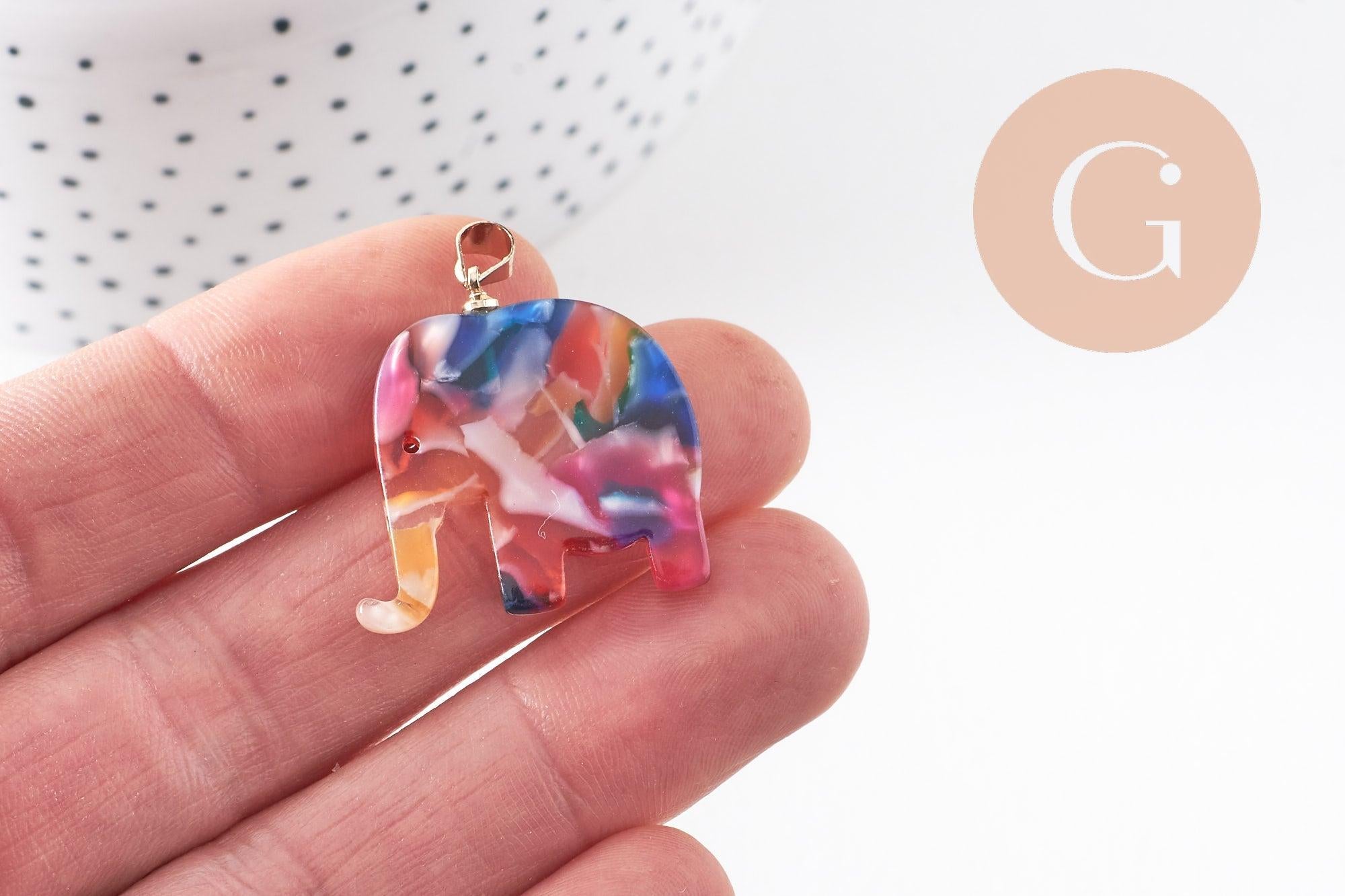 Pendentif éléphant écaille multicolore, acétate et laiton doré, création bijoux, perles plastique,27mm, x1 (G4038)