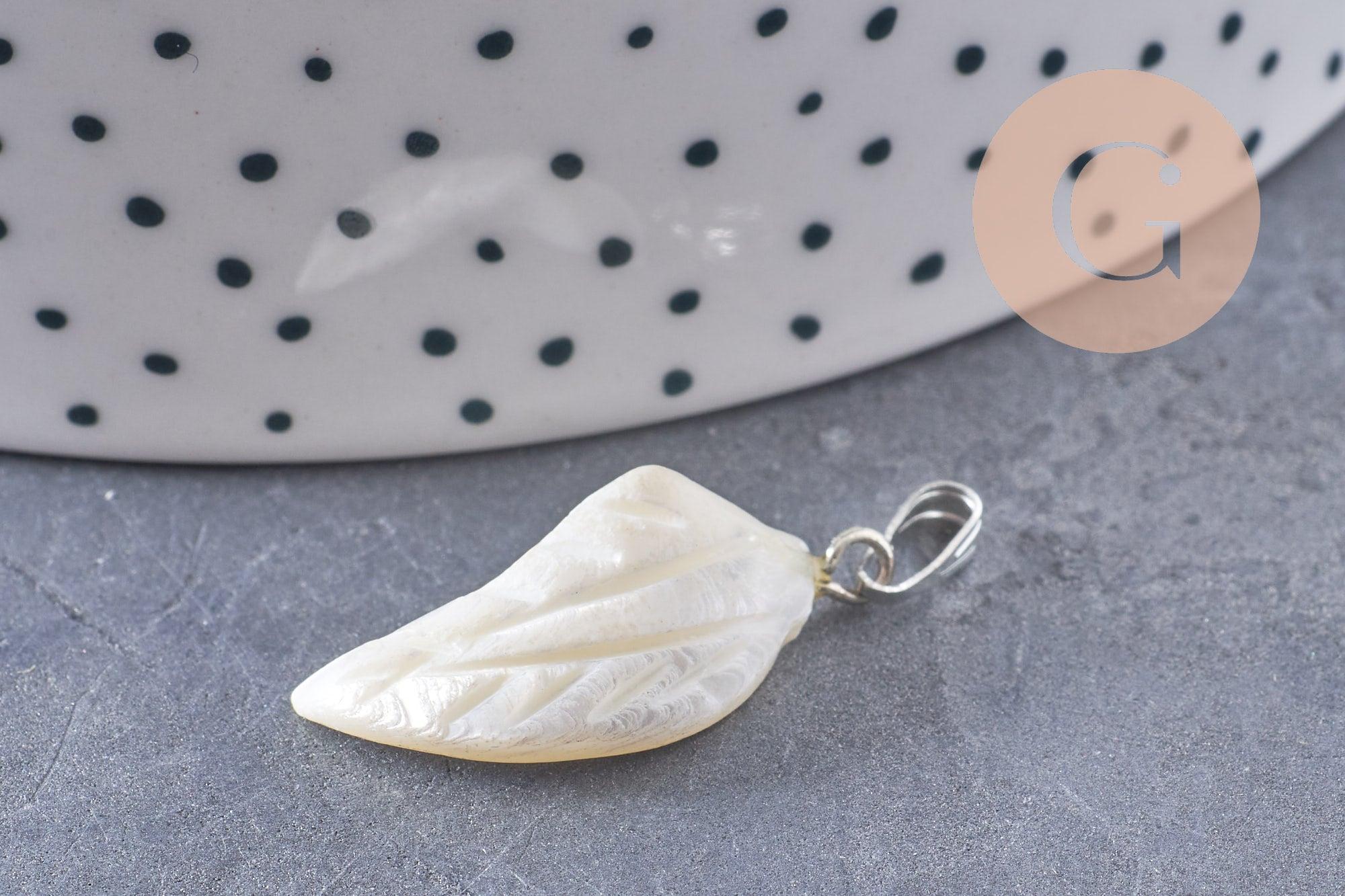 Aporta un toque natural y elegante a tus creaciones con este colgante de hoja de nácar natural montado sobre un soporte de zamac acabado platino .