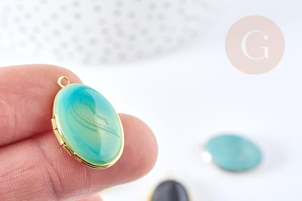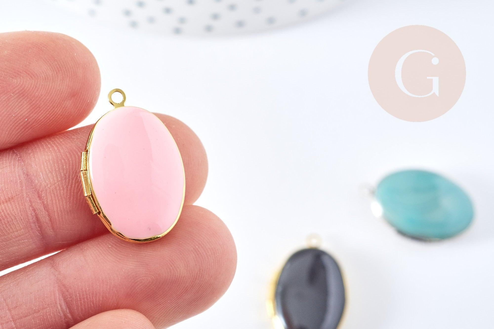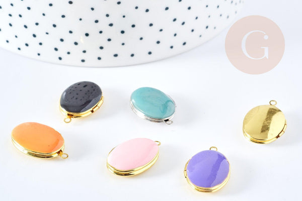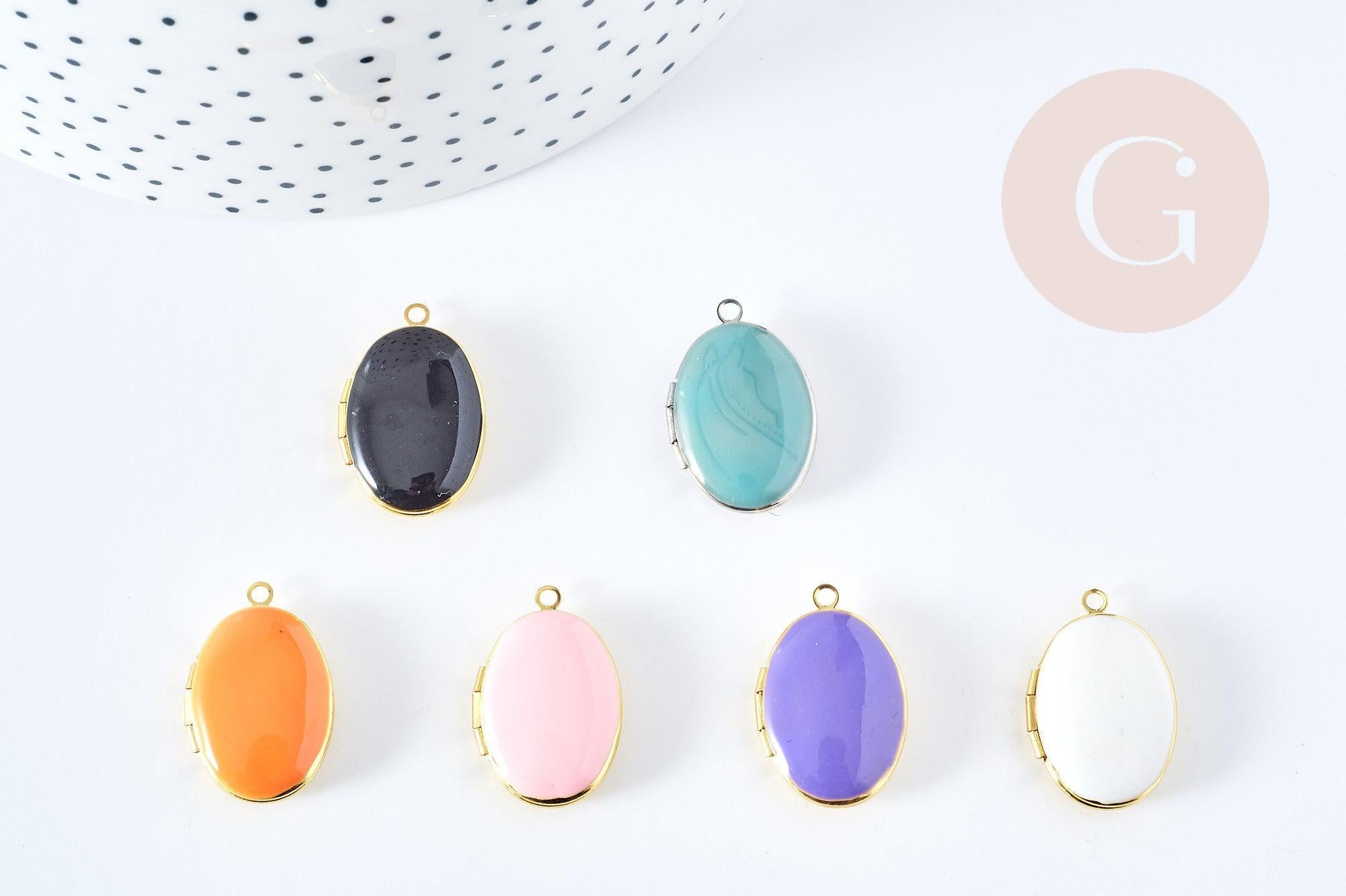 Colgante relicario ovalado, latón chapado en oro o plata con esmalte, 24 mm, 1 unidad (G8606)