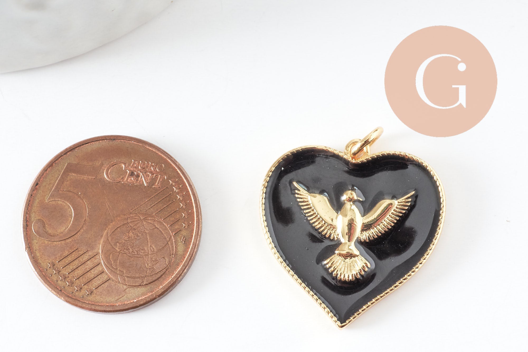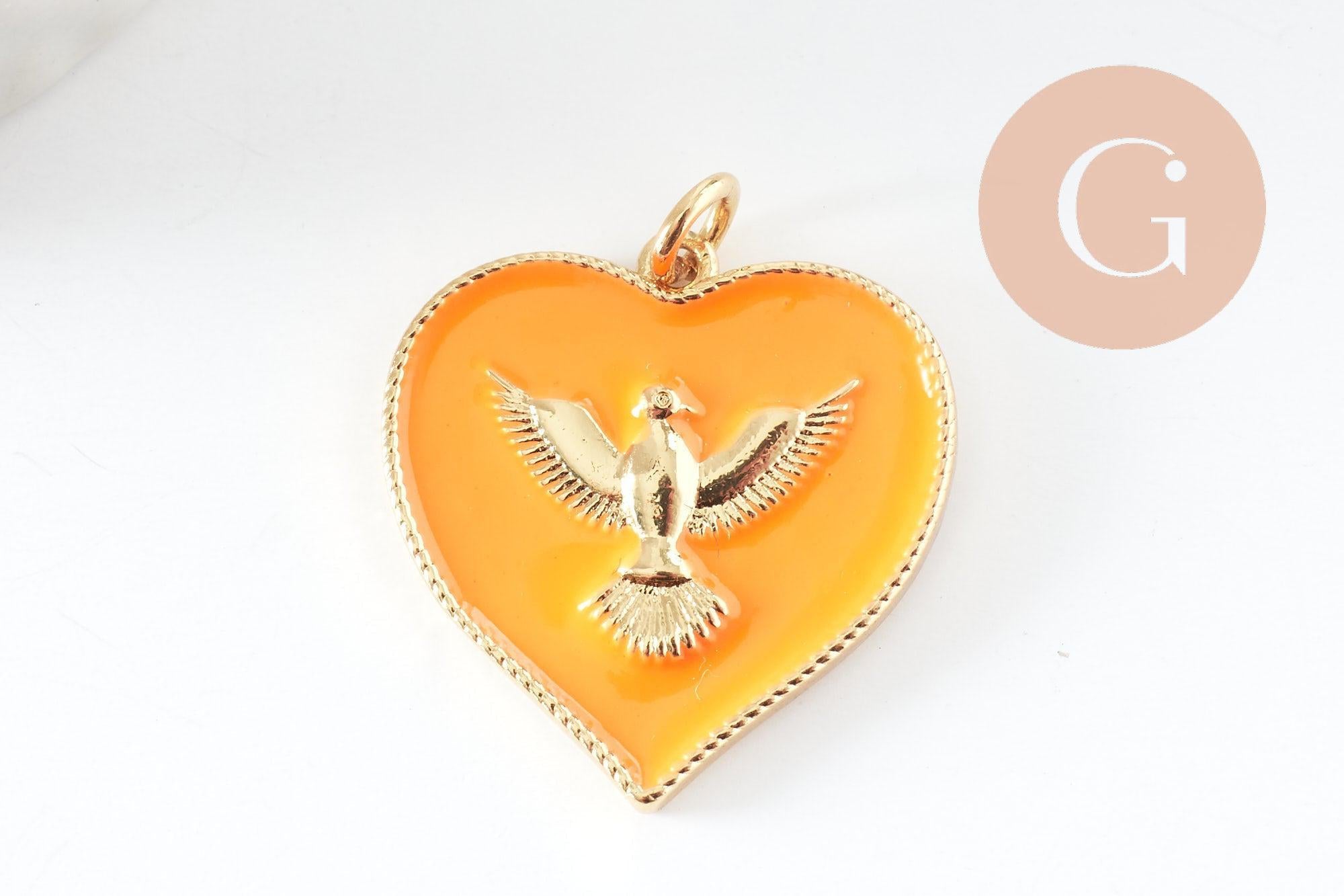Bonita medalla dorada que representa un corazón esmaltado en resina de colores con un pájaro dorado en el centro. Un colgante ideal para crear tus creaciones de joyas o pendientes.