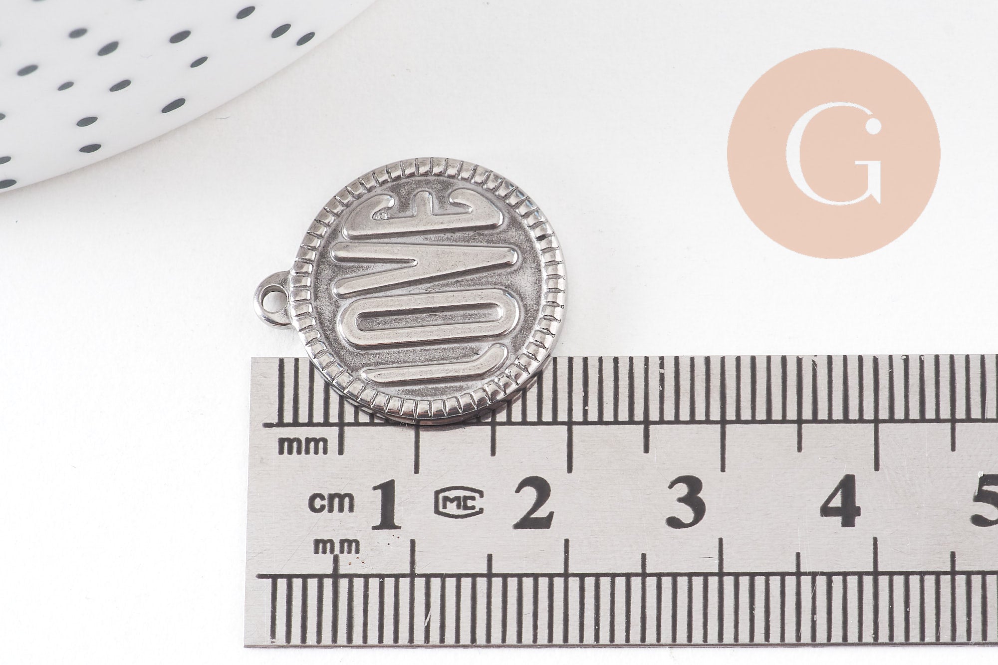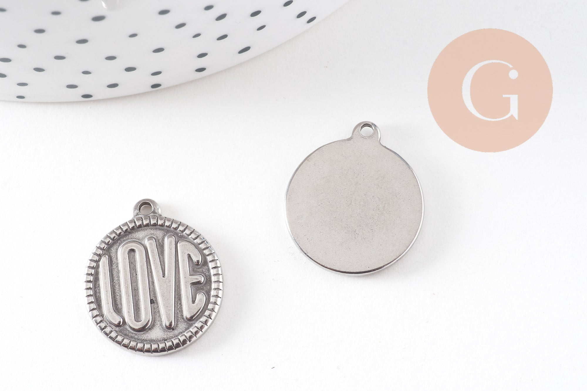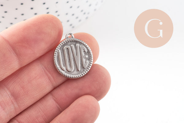 Pendentif médaille ronde LOVE acier 201 inoxydable platine 21mm, x1 (G10799)