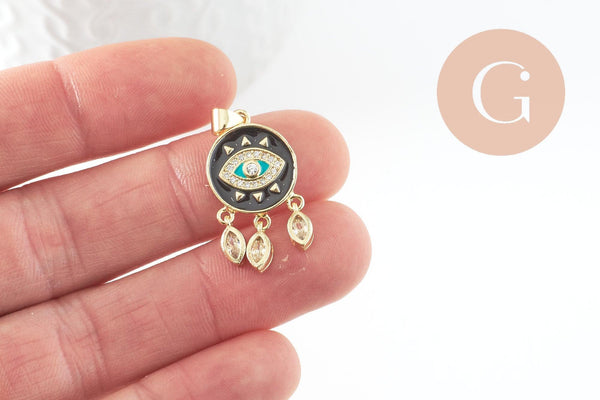Una bonita medalla de ojo dorado contra el mal de ojo, dorada y esmaltada con resina de colores, decorada con colgantes de circonitas.
