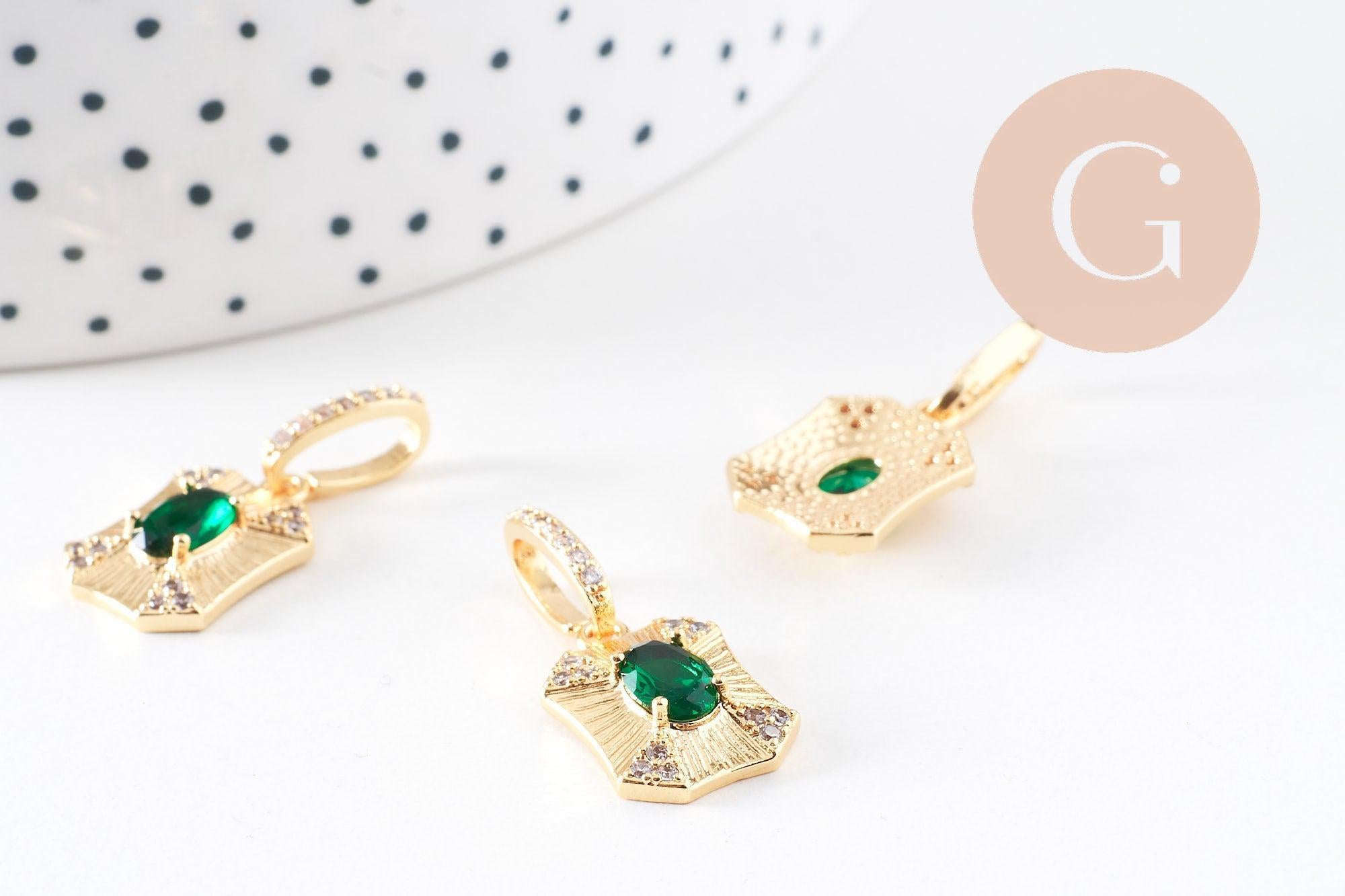 Pendentif octogone zircon blanc et vert laiton doré 18K 25mm, x1 (G10081)
