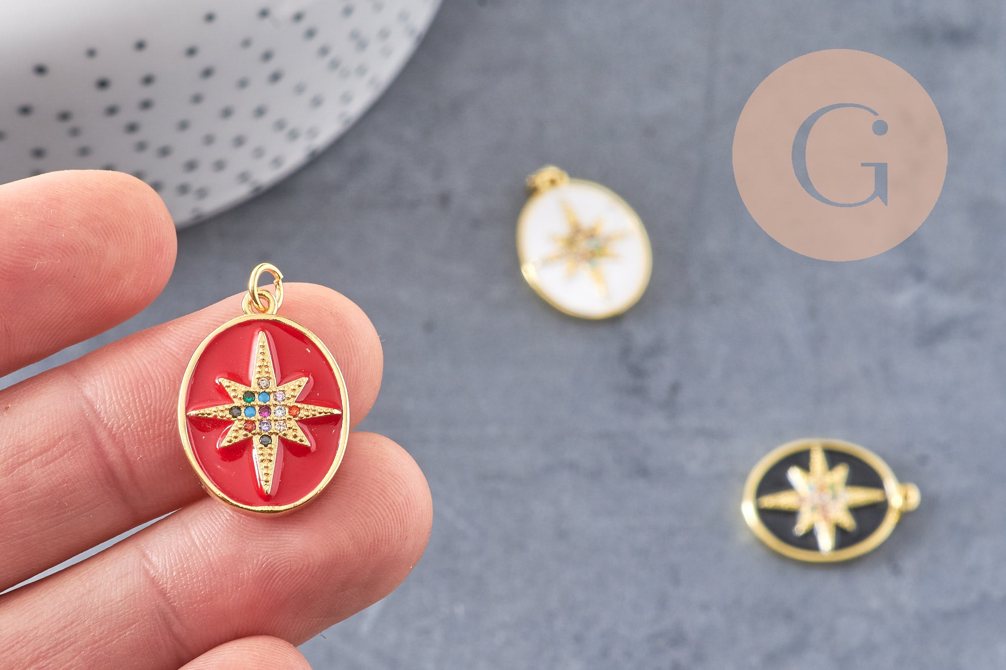 Colgante ovalado de metal dorado decorado en esmalte negro, rojo o blanco, decorado con circonitas, con una estrella en el centro.