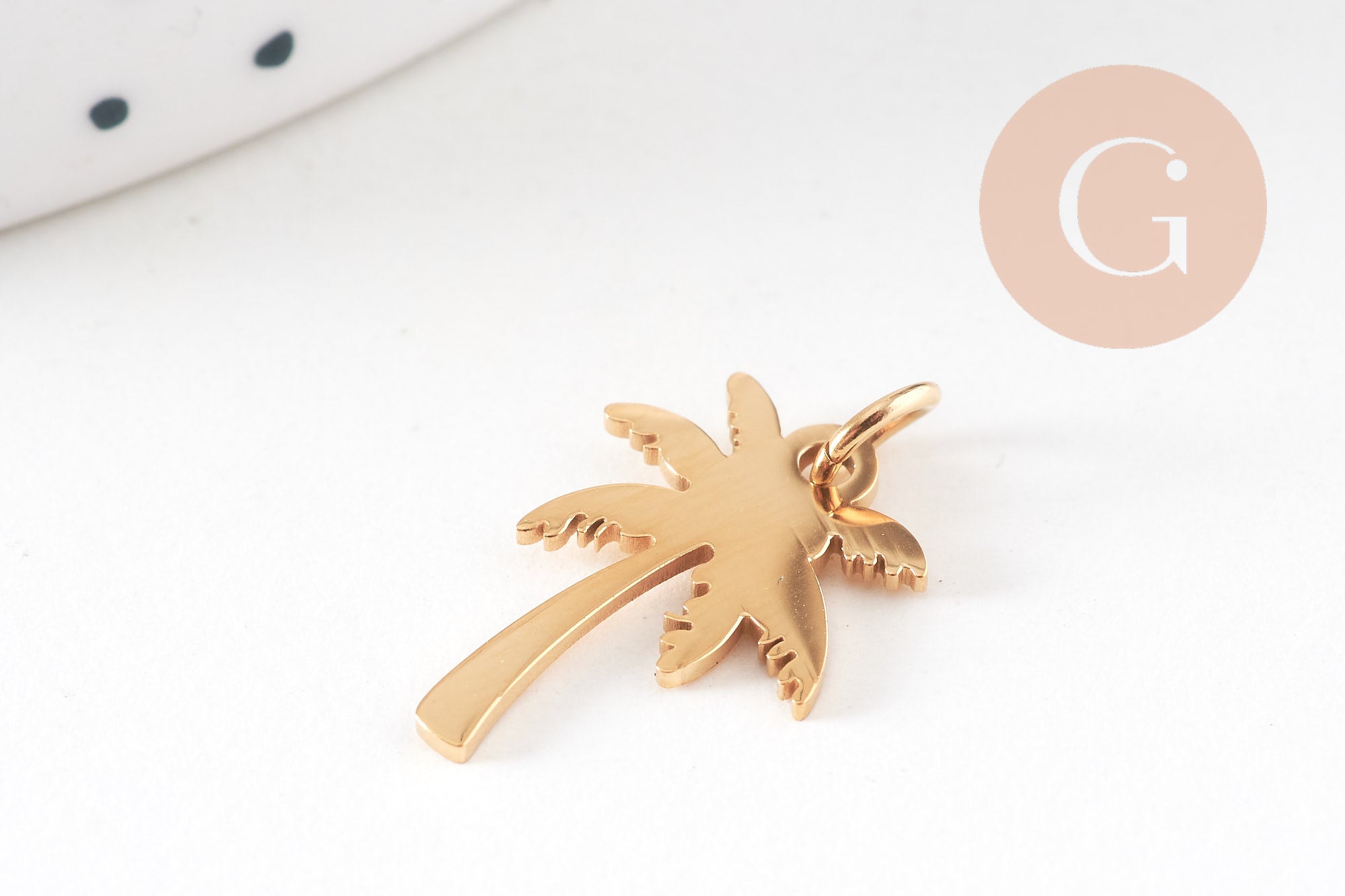 Dale un toque exótico y veraniego a tus creaciones con este colgante de palmera en acero inoxidable chapado en oro de 18 quilates (IP) . Símbolo de evasión y sol, es perfecto para crear joyas de verano vibrantes y a la moda.