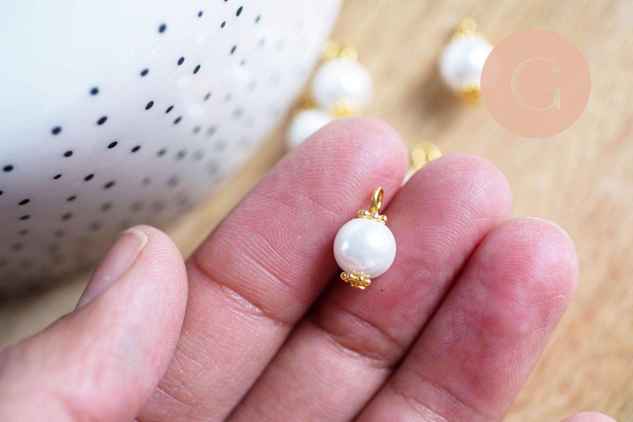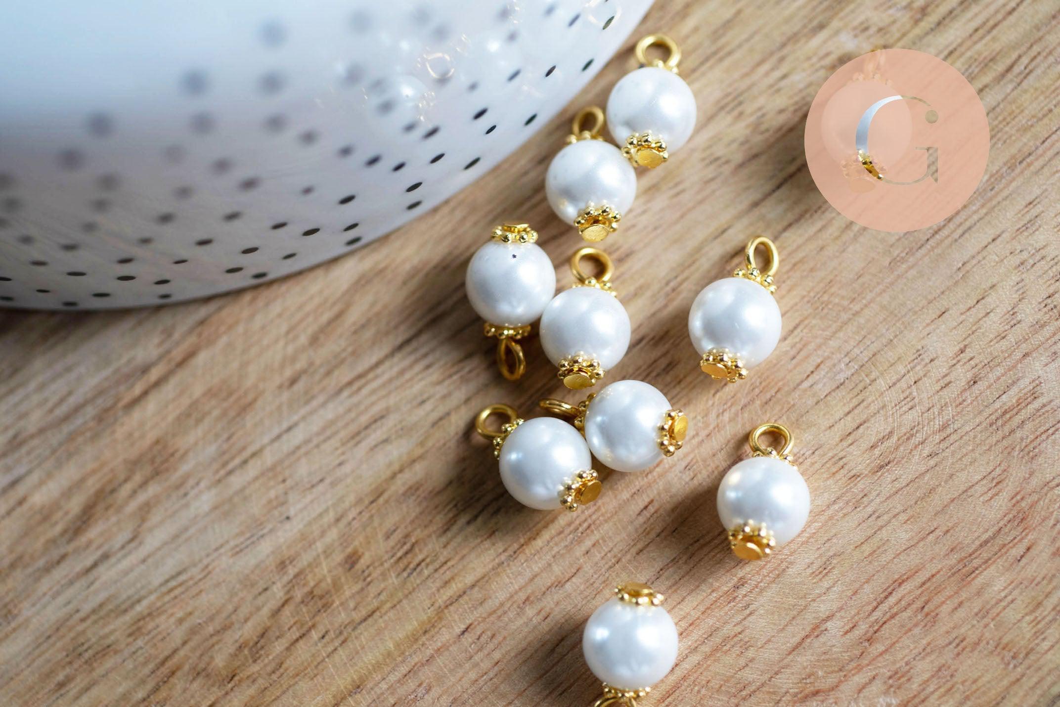 Colgante de perla redonda de cristal blanco perlado, latón bañado en oro, 14 mm, x10 (G7136)