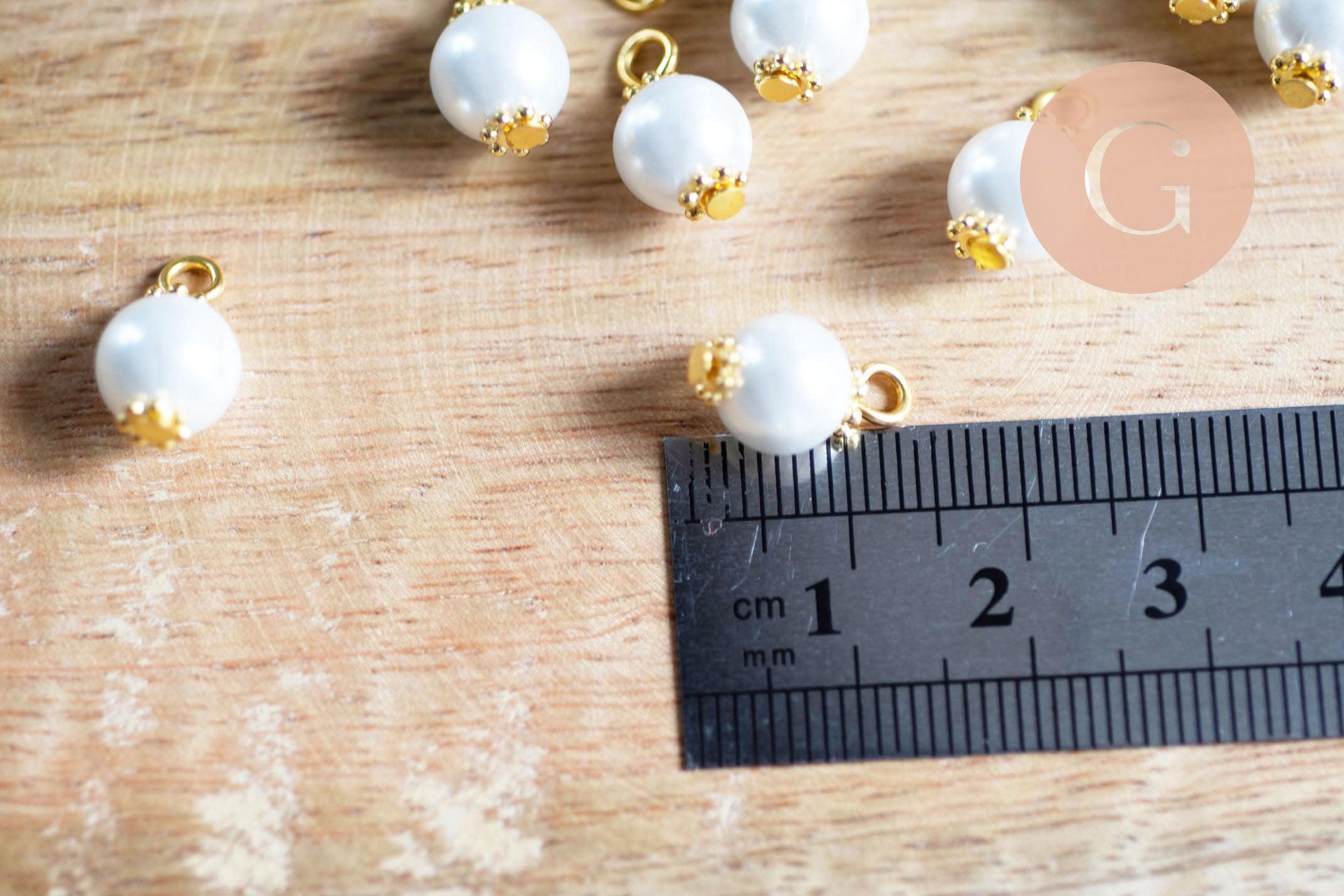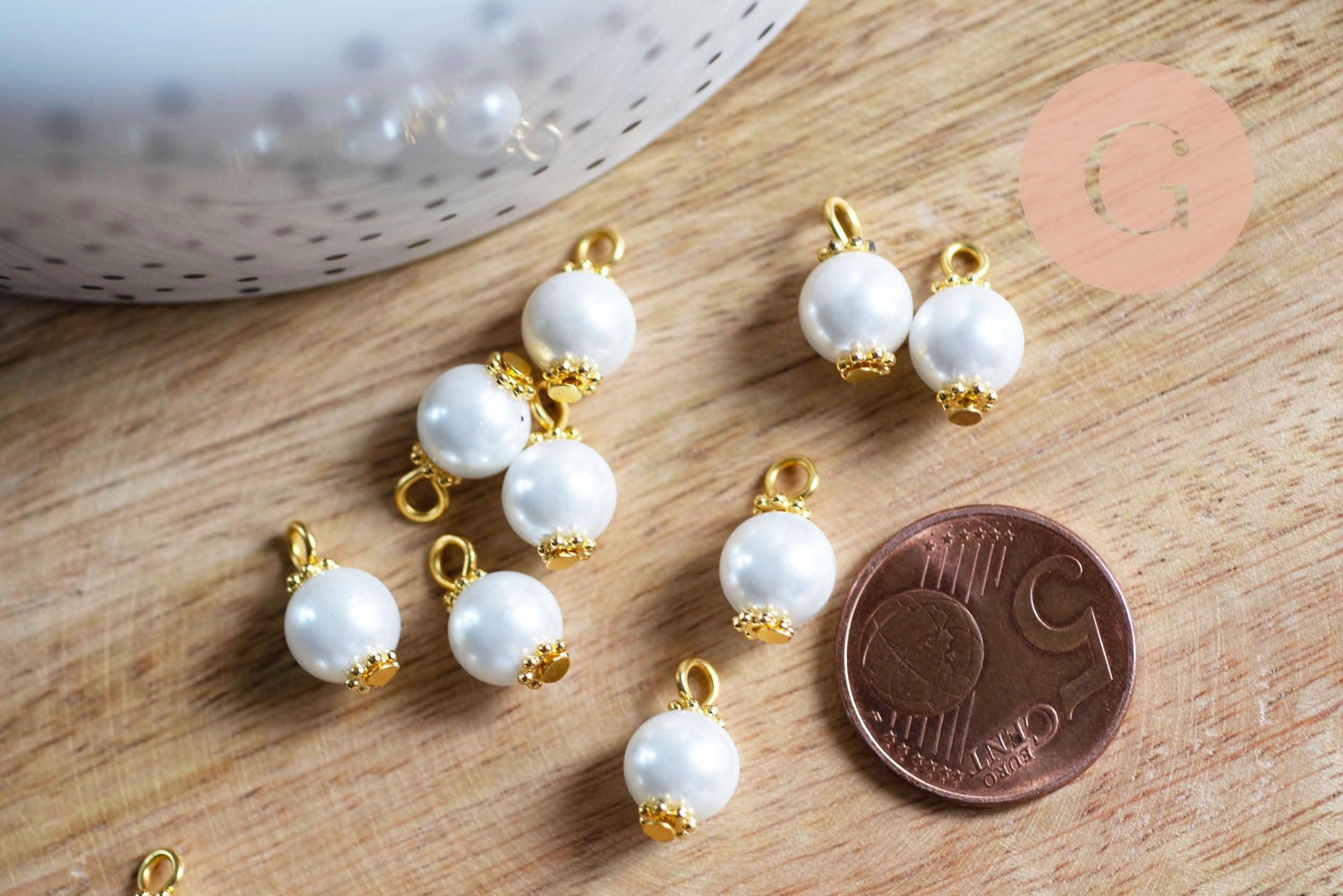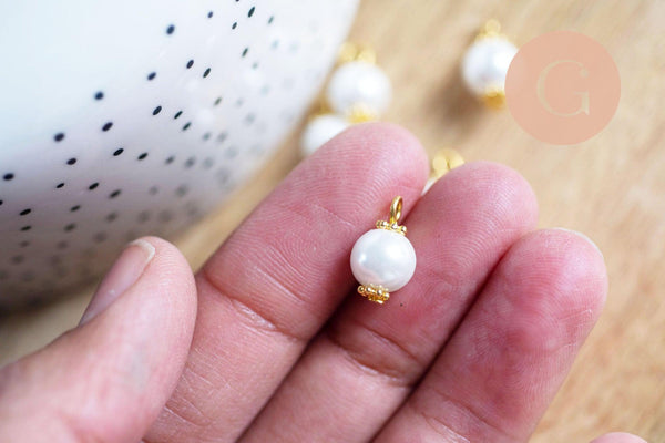 Pendentif perle ronde verre blanc nacré laiton doré 14mm, x10 (G7136)