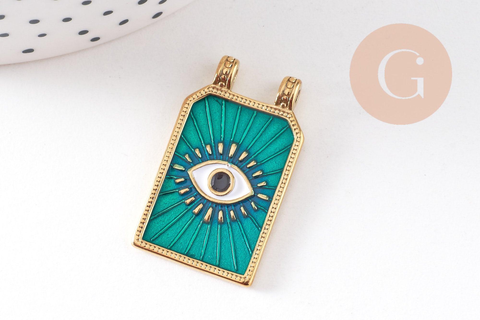 Añade un toque simbólico y colorido a tus creaciones con estos colgantes rectangulares de acero inoxidable chapado en oro , adornados con un motivo esmaltado de un ojo protector o un corazón sagrado. Su diseño místico y moderno los convierte en piezas llamativas para joyería única y con significado.