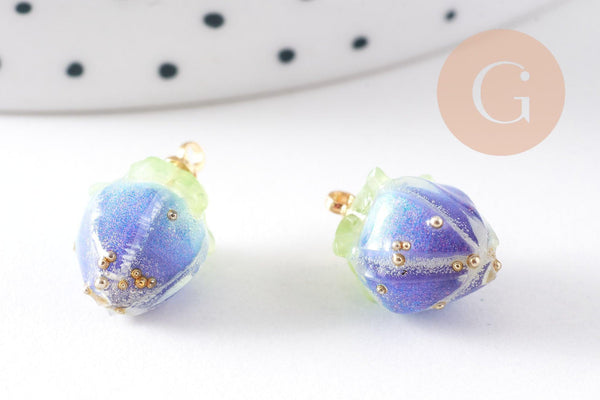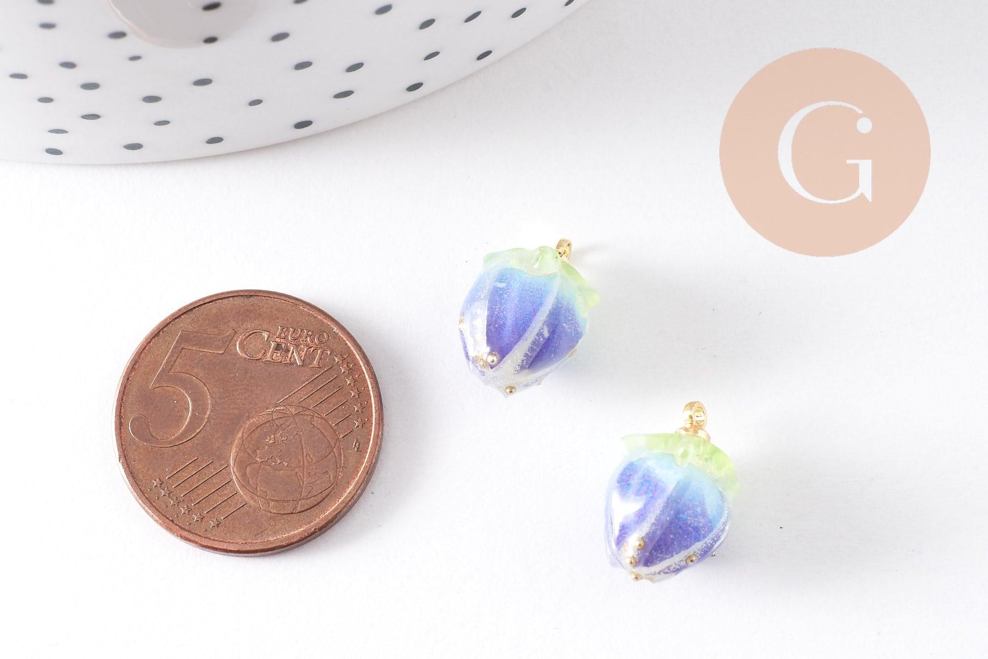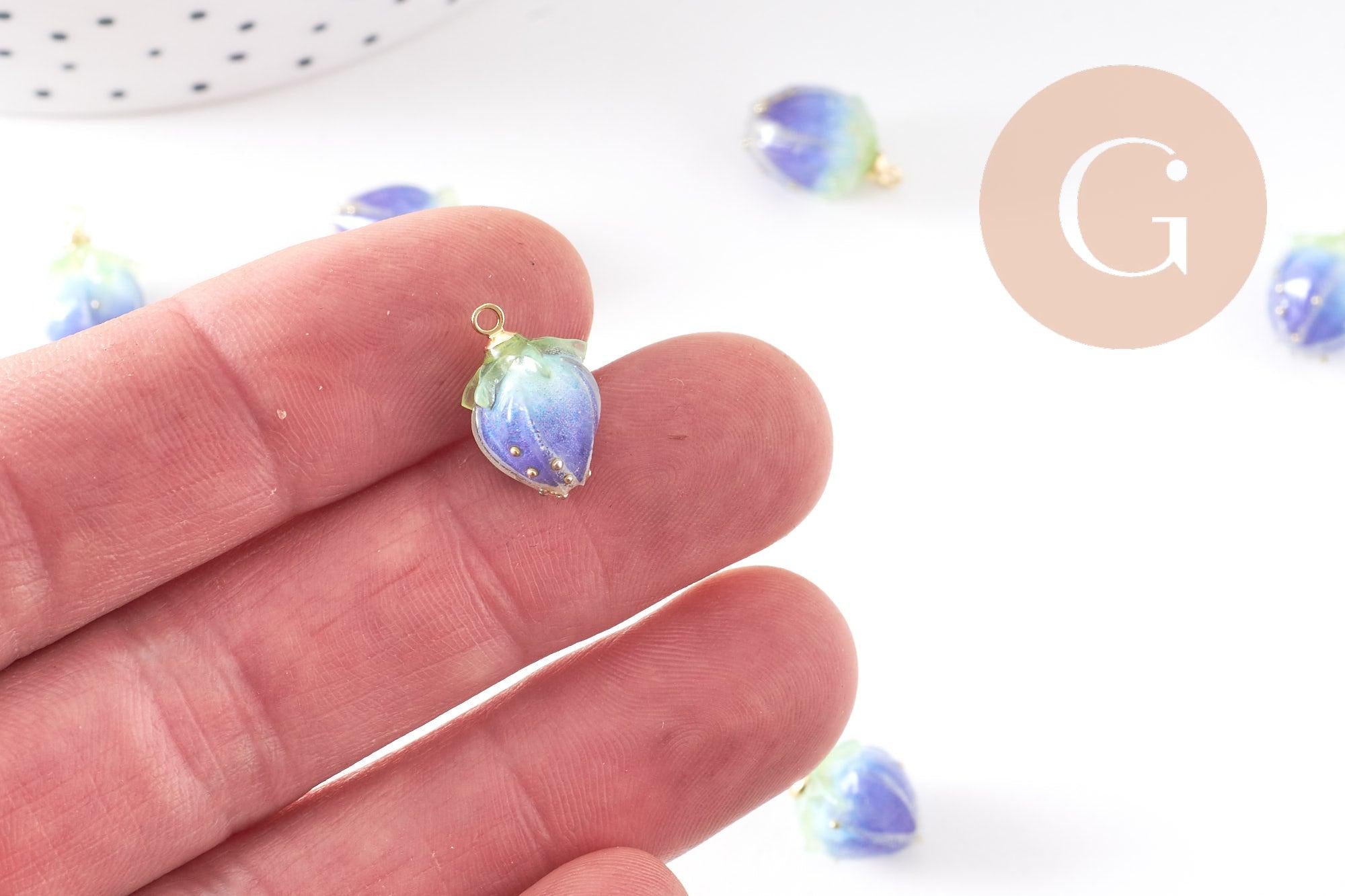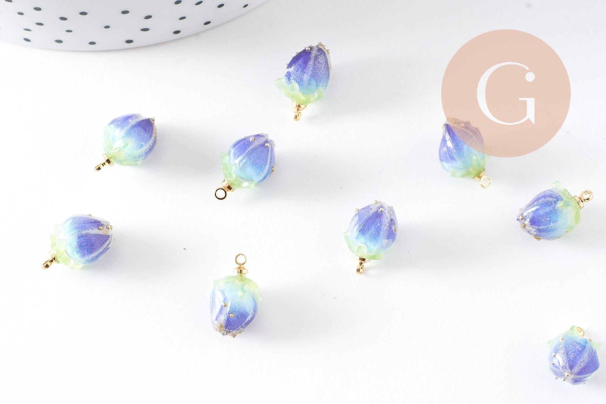 Pendentif résine fleur séchée bleue 33mm, pendentif fleur de rose et or, x1 (G5698)
