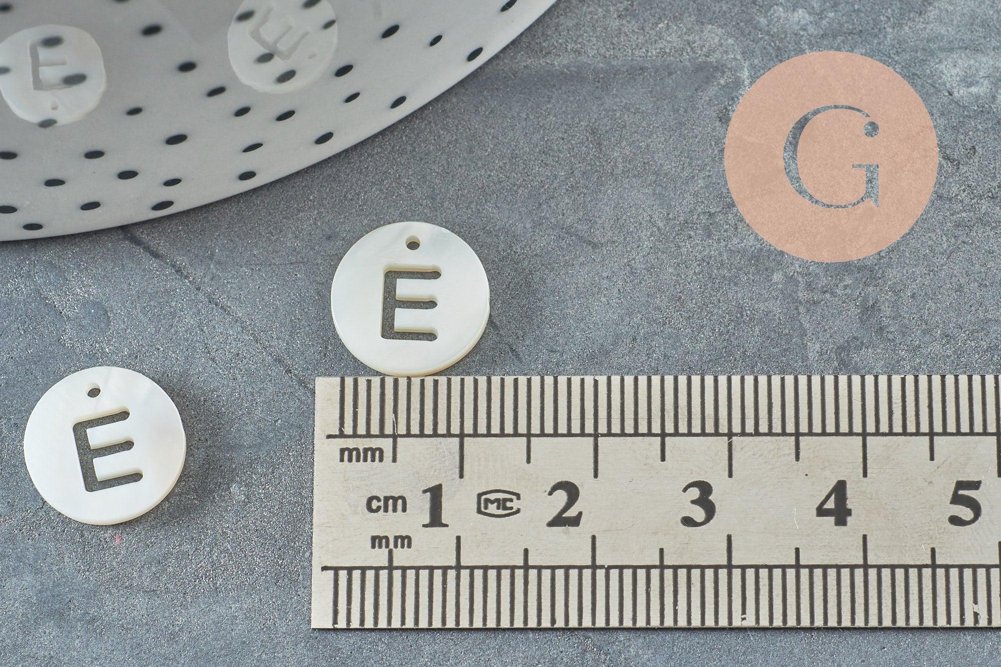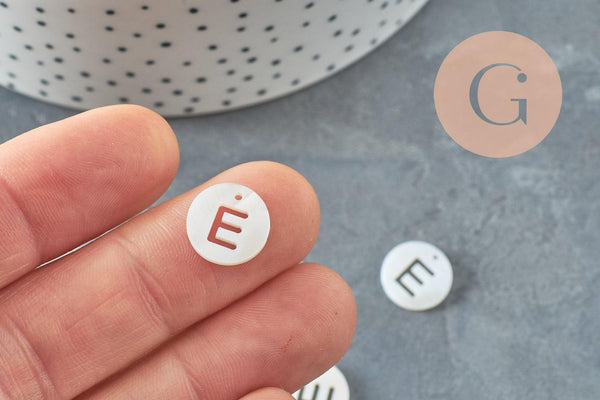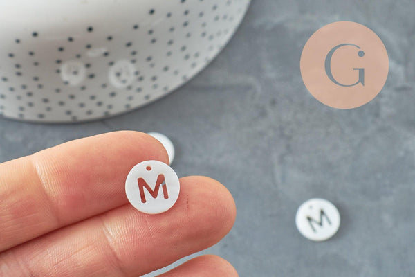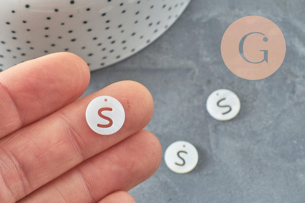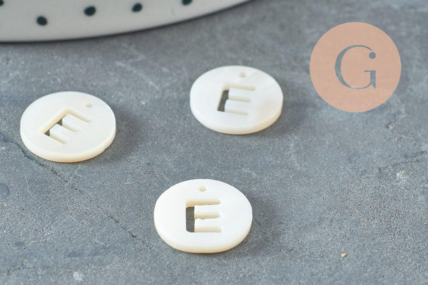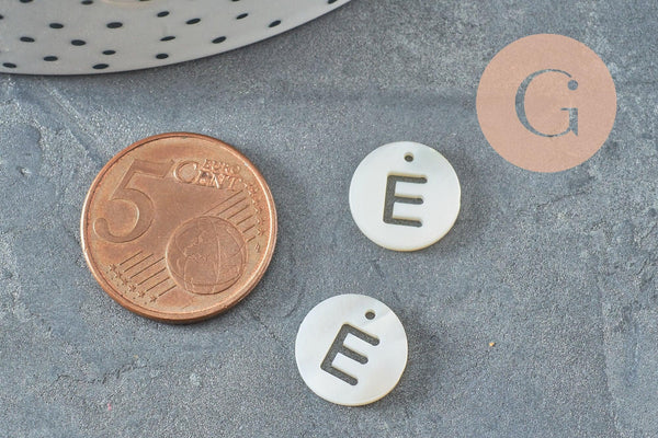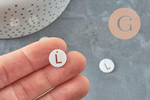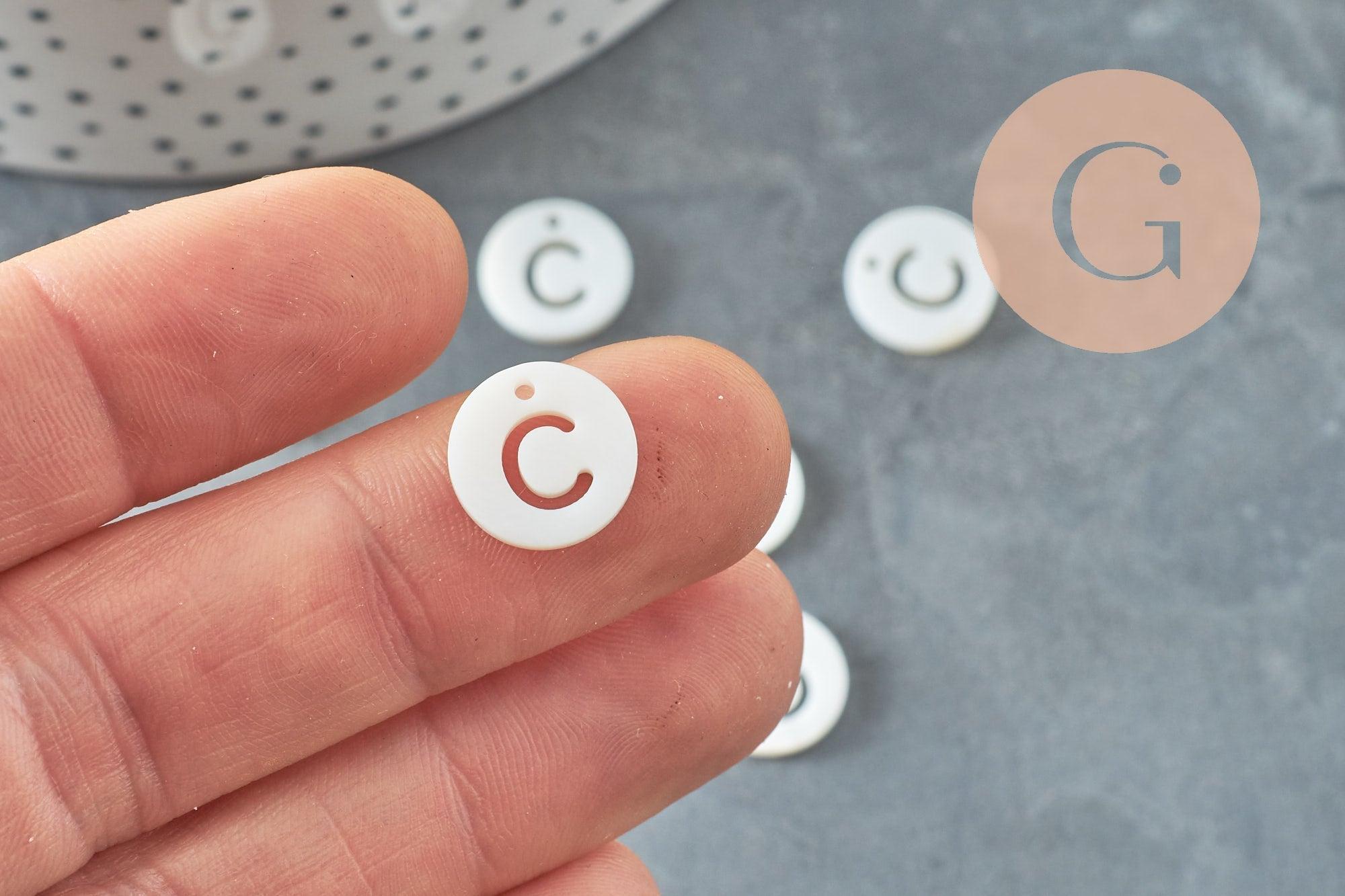 Un colgante redondo de nácar blanco con una letra mayúscula ahuecada , un dije perfecto para personalizar un collar, un sautoir o unos pendientes.