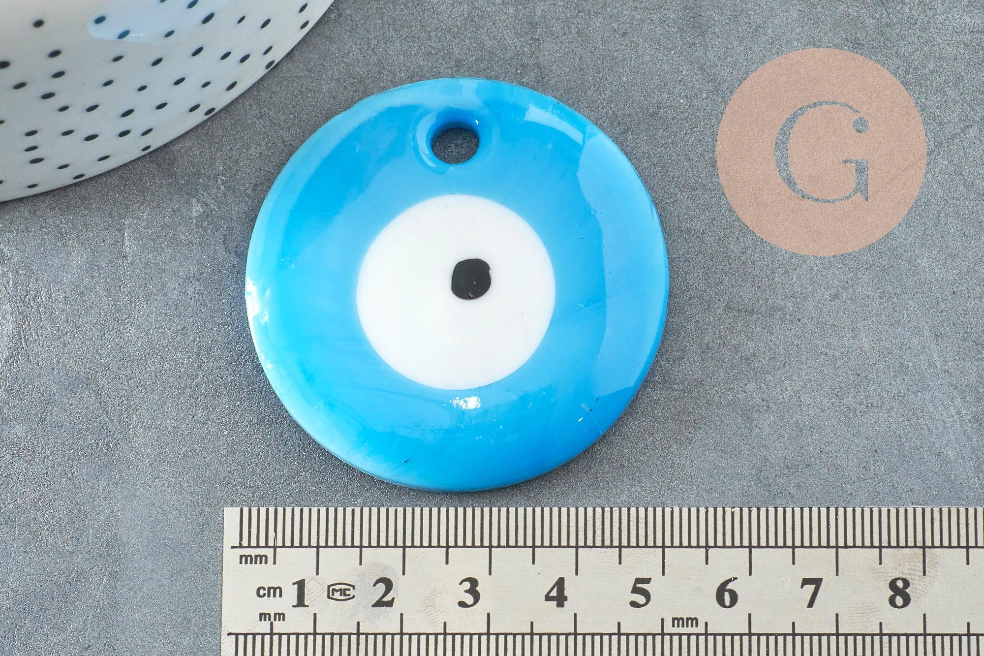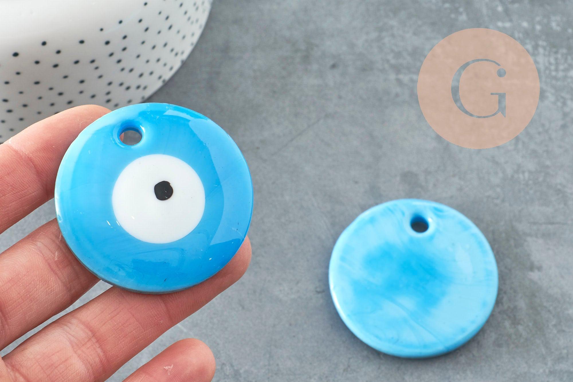 Adopte este colgante redondo Evil Eye de cristal azul y deje que su creatividad se exprese. Añade un toque de suerte y protección a tus diseños de joyería únicos y significativos.