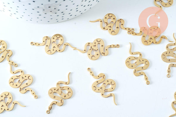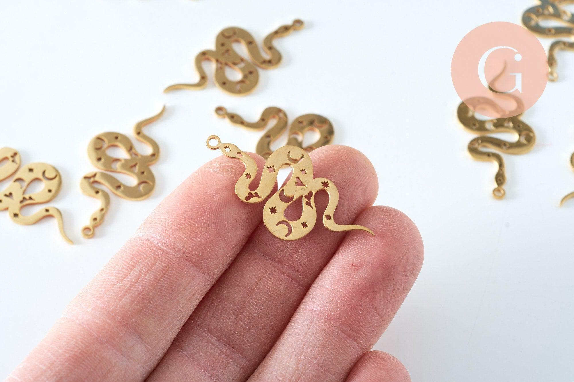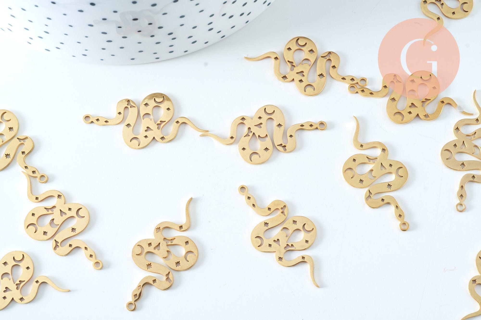 Déjate seducir por este colgante calado en forma de serpiente con lunas y corazones, fabricado en acero inoxidable 201 chapado en oro . Finamente cortado a láser, añadirá un toque místico y moderno a tus creaciones de joyería DIY.