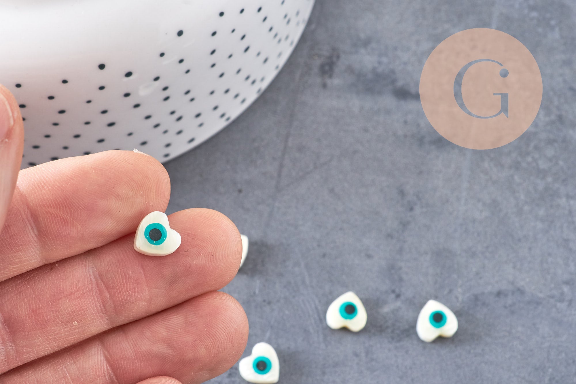 Para personalizar sus joyas y otros accesorios textiles o de piel suave, opte por este juego de 10 cabujones de nácar blanco que representan el ojo de la suerte.